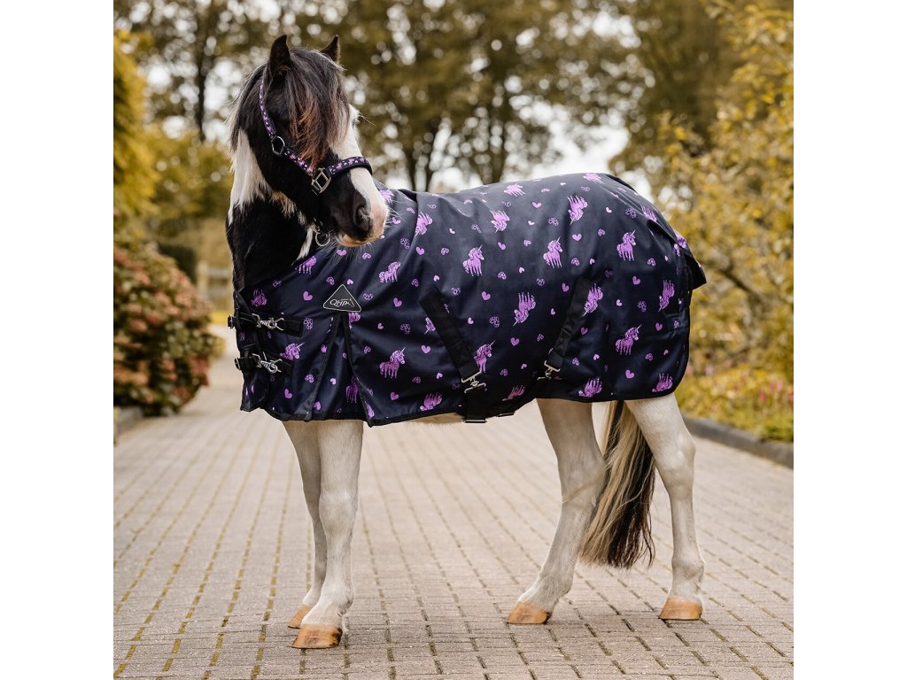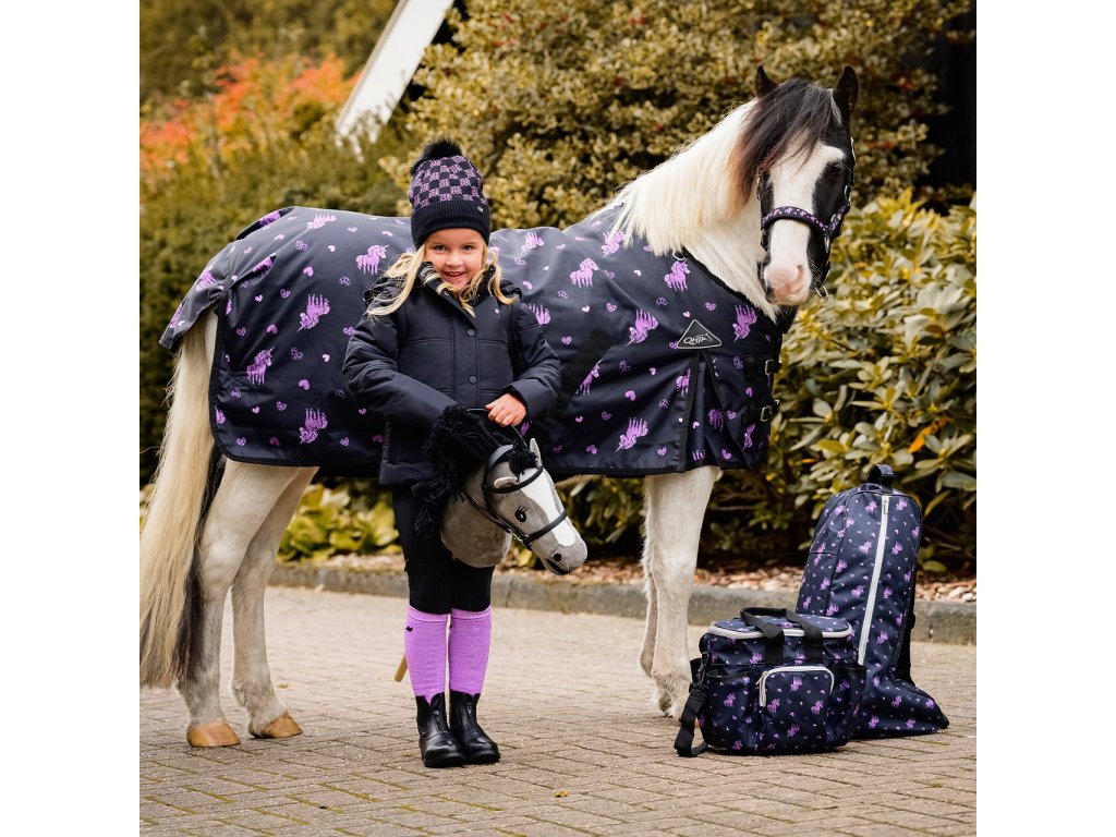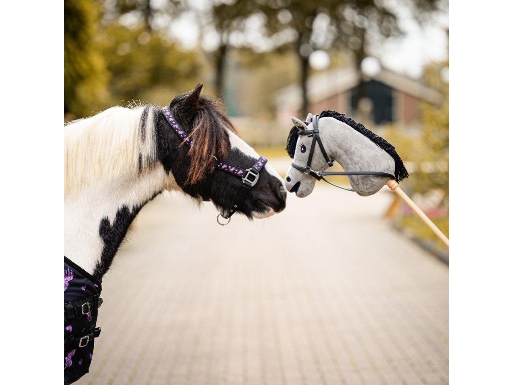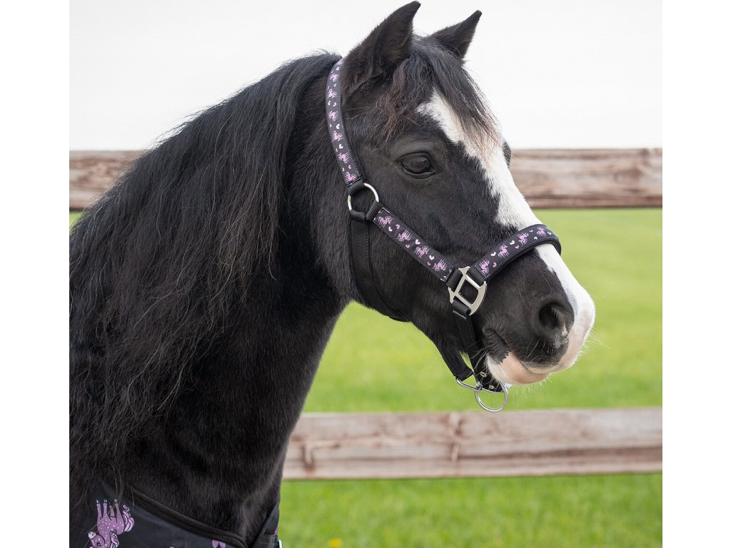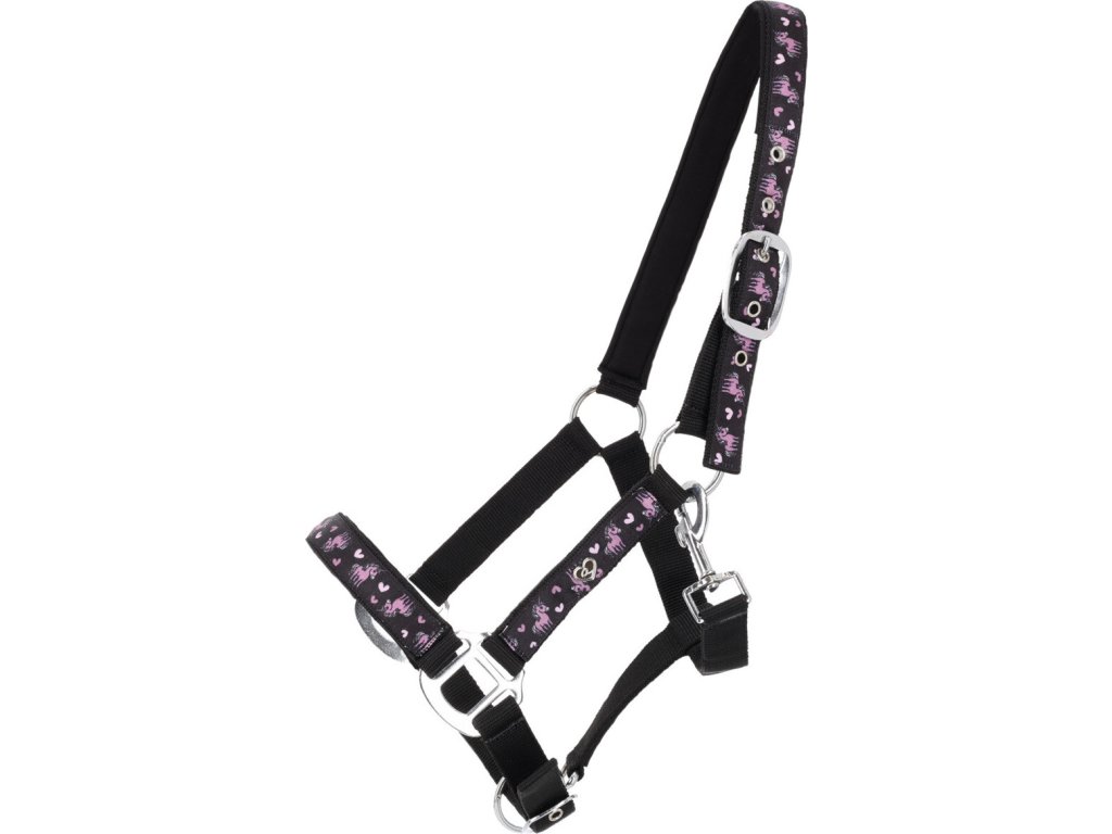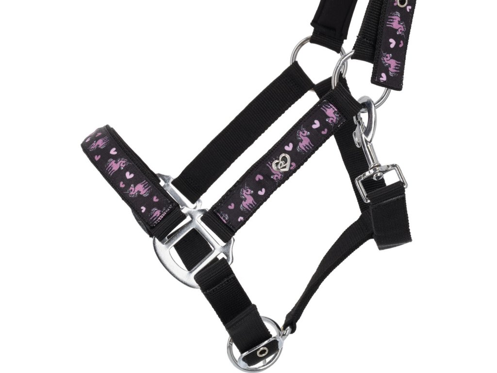 Wygodny kantar z kolekcji Lize, ozdobiony nadrukiem, który nadaje mu radosny wygląd. Kantar jest podszyty w okolicach nachrapnika i paska potylicznego i ozdobiony uroczą klamrą w kształcie serduszka. Rozmiar można regulować w zależności od potrzeb.