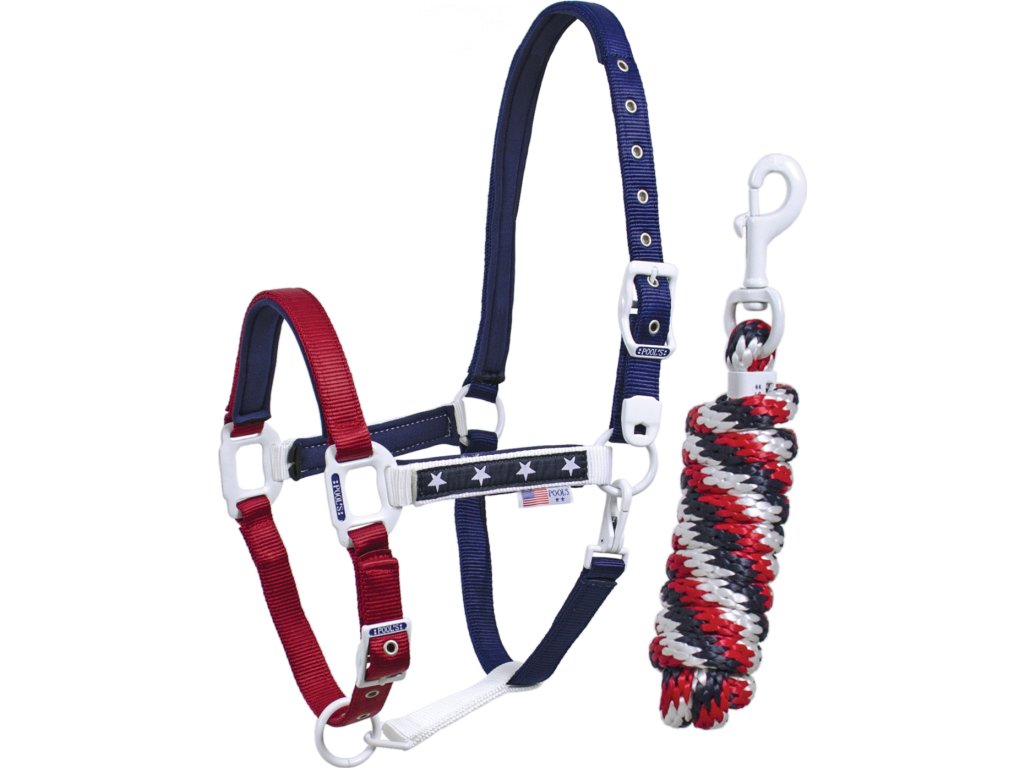Wysokiej jakości kantar firmy POOL'S, wykonany z nylonu z neoprenowym podszyciem. Wyposażony w białe klamry ze stali nierdzewnej, które są bardzo wytrzymałe. Kantar jest regulowany w obszarze paska potylicznego i nachrapnika. W pięknym kolorze amerykańskiej flagi. Dostępny w rozmiarach PONY, COB i FULL.