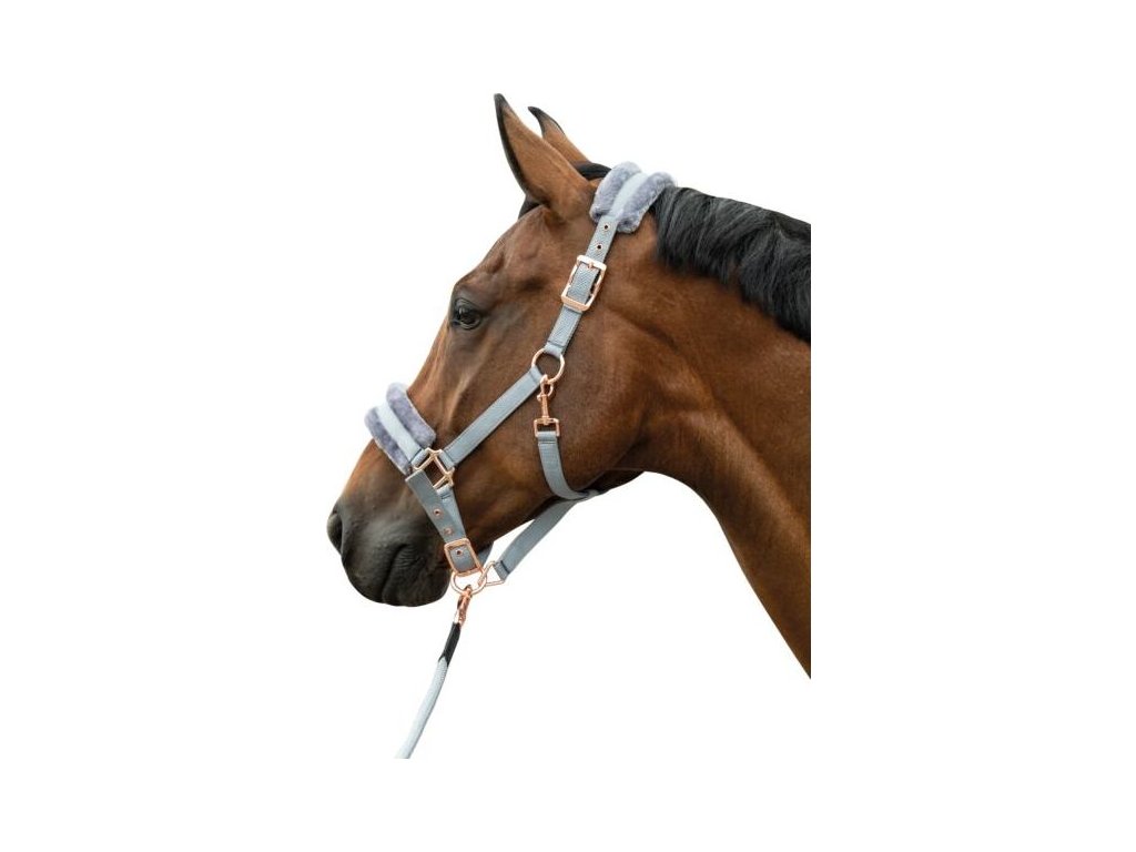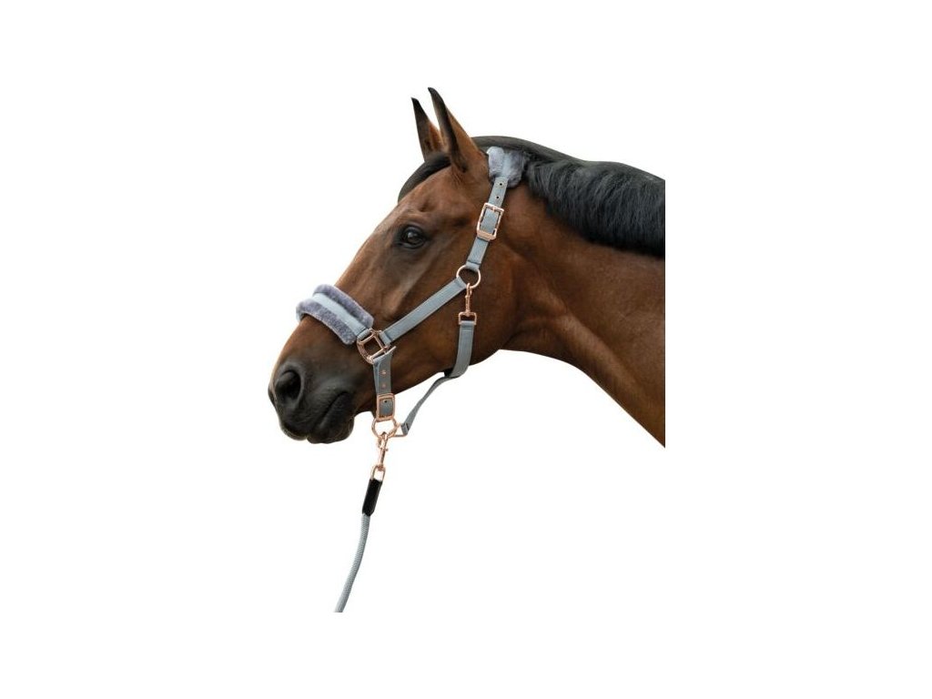Elegancki, wysokiej jakości kantar z okuciami w kolorze różowego złota. Kantar posiada miękkie wypełnienie z syntetycznej wełny na nachrapniku i pasek potyliczny. Dzięki temu jest odpowiedni dla wrażliwych koni, zapewniając optymalny komfort. Kantar ma regulowany rozmiar po obu stronach paska potylicznego i na nachrapniku. Posiada klasyczny karabińczyk.