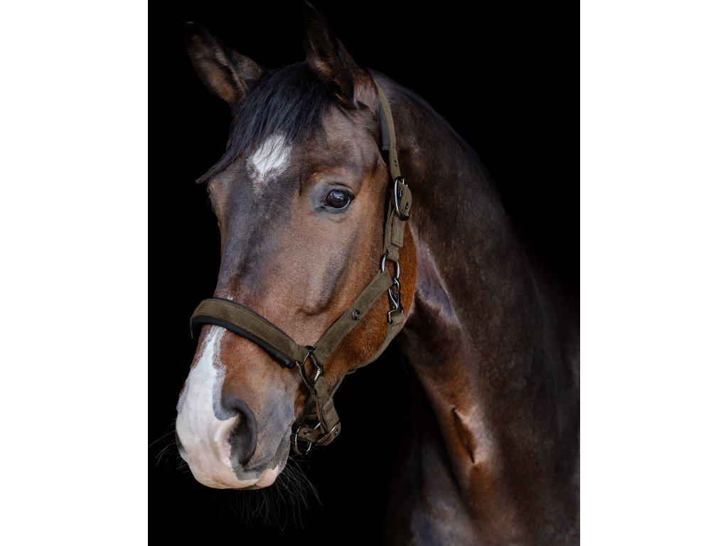 Elegancki kantar wykonany ze sztruksu z miękkim podszyciem w okolicy potylicy i nachrapnika zapewnia koniowi maksymalny komfort. Wysokiej jakości okucia w kolorze antracytowej szarości, wraz z metalową zawieszką w tym samym kolorze, nadają kantarowi stylowy i nowoczesny wygląd. Dzięki możliwości regulacji nachrapnika oraz obu stron paska potylicznego, kantar można łatwo dopasować do indywidualnych potrzeb konia.