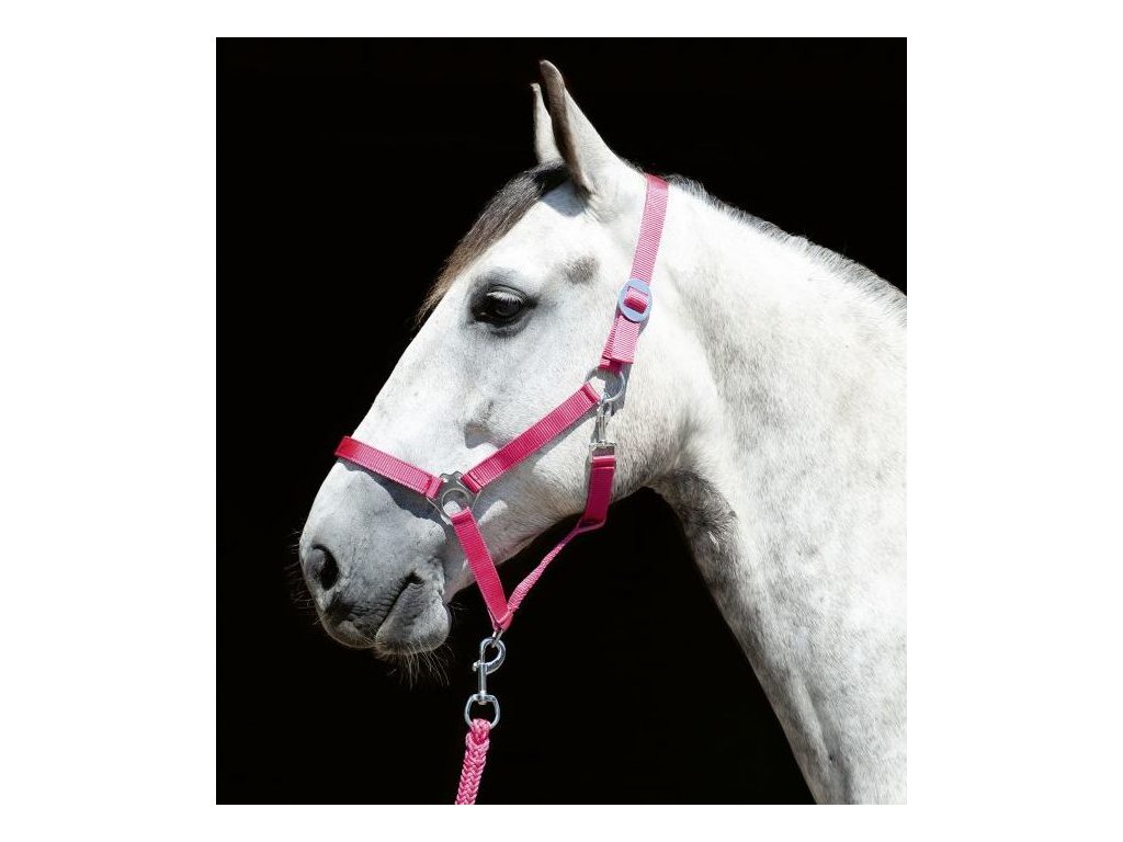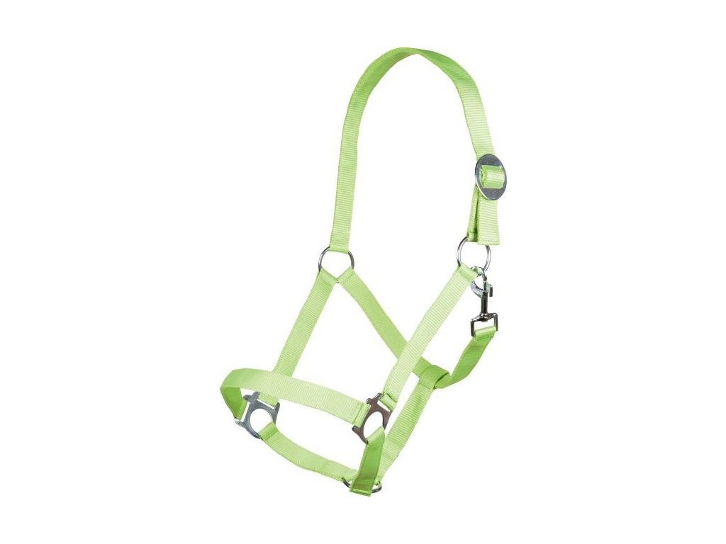 Regulowany nylonowy kantar dostępny w różnych kolorach i rozmiarach. Kantar można regulować za pomocą przesuwanej sprzączki. Zapinany na karabińczyk.