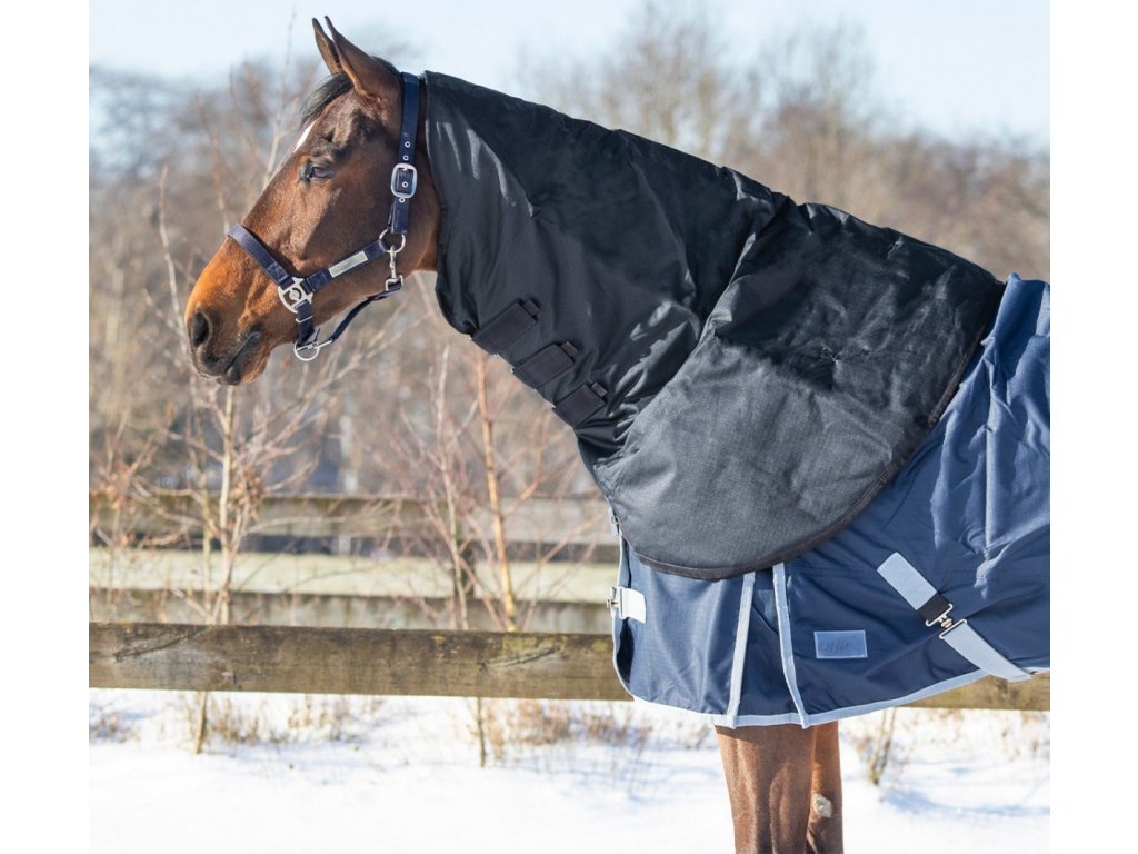 Wodoodporny element na szyję z wypełnieniem termicznym 150 g zapewnia niezawodną ochronę przed deszczem, zimnem i wiatrem. Wykonany jest z trwałego i oddychającego materiału o wytrzymałości 600 D. Dzięki wodoodporności na poziomie 3000 mm/m² skutecznie zapobiega przemakaniu. Element na szyję jest kompatybilny z derkami wyposażonymi w D-ringi. Łatwe mocowanie za pomocą trzech pasków z karabińczykami. Ze specjalnym rozmiarem dla koni fryzyjskich i barokowych.