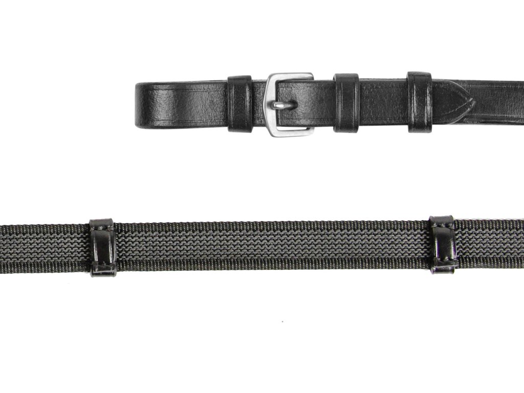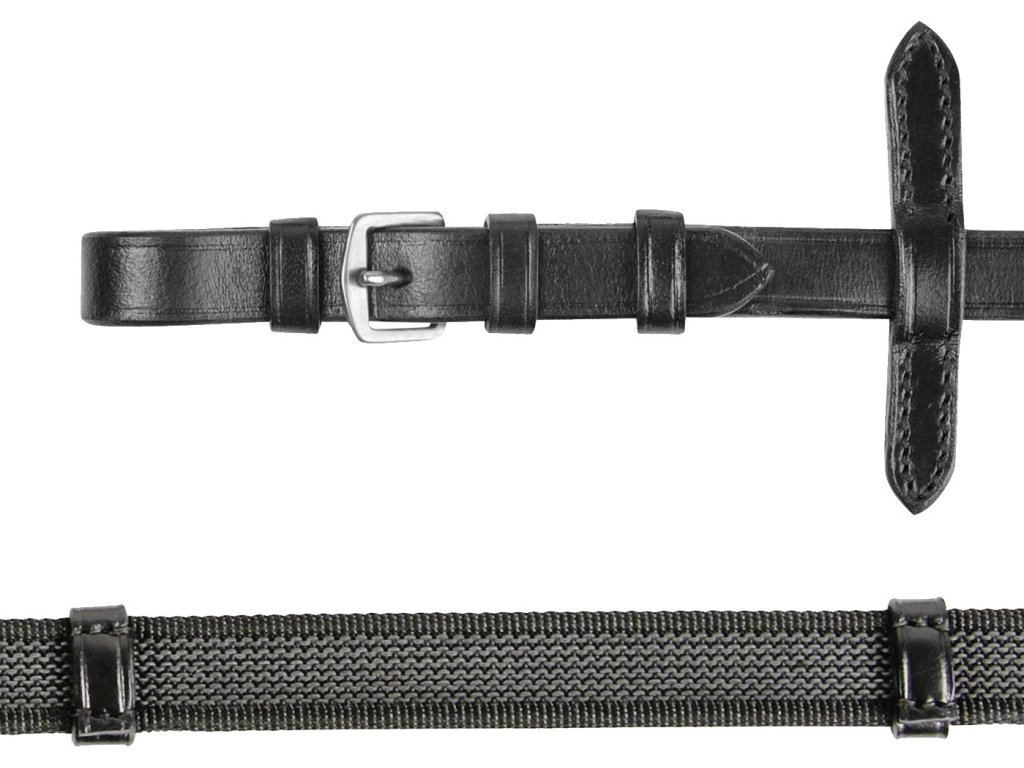 Wysokiej jakości wodze wykonane z wytrzymałej skóry premium. Są podszyte antypoślizgową gumą dla optymalnej przyczepności. Wyposażone są w skórzane stopery i ograniczniki do wytoka. Okucia wykonane są ze stali nierdzewnej. Szerokość wodzy wynosi 19 mm.