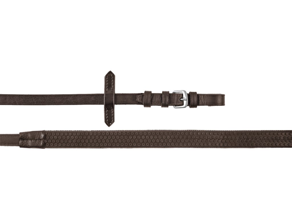 Praktyczne wodze wykonane z gumy i skóry. Dzięki antypoślizgowemu materiałowi nie ma potrzeby stosowania skórzanych stoperów. Okucia wodzy wykonane są ze srebrnej stali nierdzewnej. Wyposażone w podpórki do wytoku. Dostępne w wielu kolorach. W rozmiarach PONY, COB i FULL.