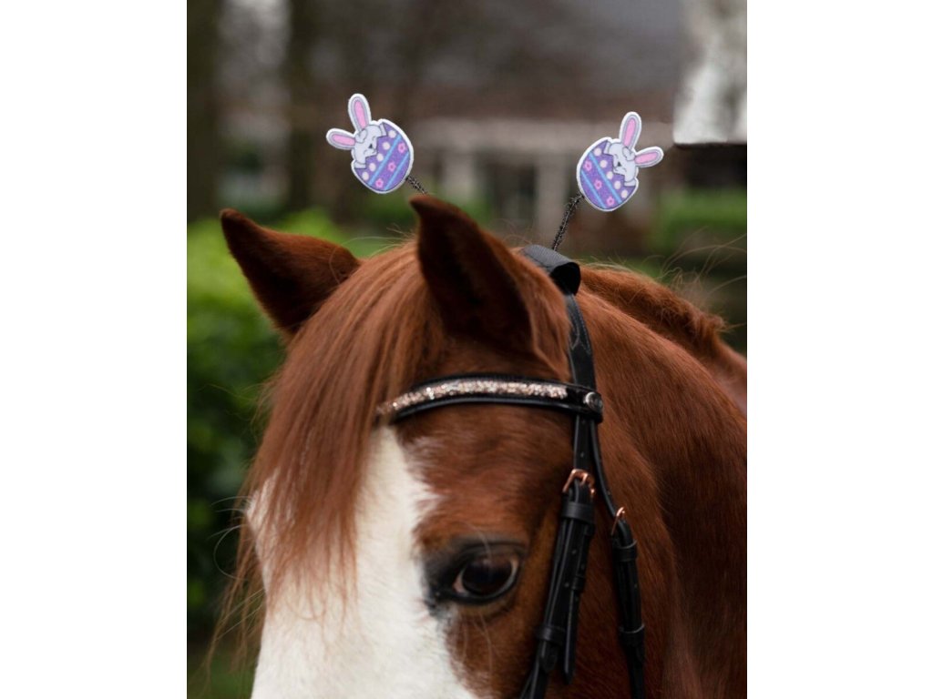 Wielkanocny dodatek dla koni. Zapinany jest na rzep wokół paska potylicznego. Długość około 15 cm. Cena dotyczy jednej pary. Idealnie pasują do innych akcesoriów wielkanocnych.