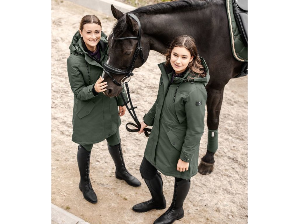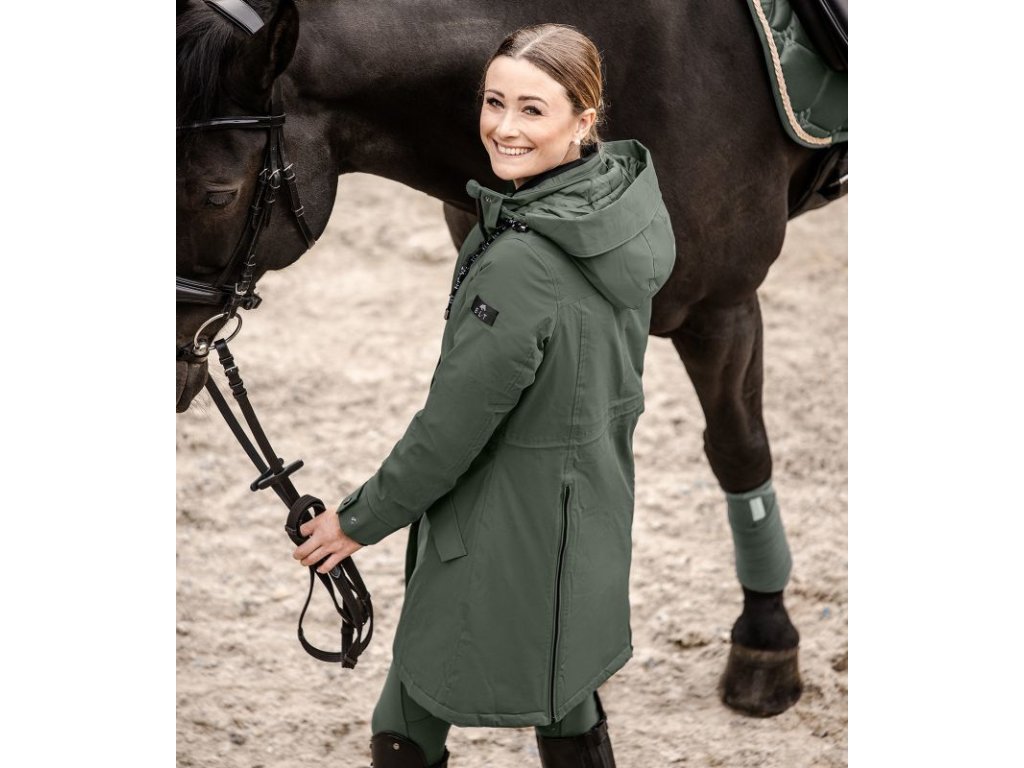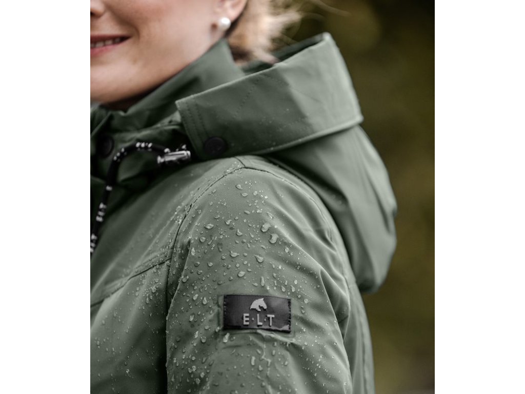 Modna i wysoce funkcjonalna zimowa kurtka jeździecka wykonana z oddychającego materiału. Kurtka jest wiatroodporna i wodoodporna (o słupie wody 5 000 mm). Dzięki wypełnieniu i uszczelnionym szwom zapewnia wspaniałe ciepło w chłodne zimowe dni. Krój jest prosty, szerokość można regulować w pasie za pomocą sznurka. Wyposażona w odpinany kaptur z regulacją szerokości i możliwością przymocowania z tyłu. Kaptur ma rozkładany daszek. Posiada wysoki kołnierz na szyi, dwukierunkowy zamek błyskawiczny z osłoną podbródka, boczne kieszenie i kieszeń wewnętrzną. Końce rękawów mają regulowaną szerokość i wewnętrzne prążkowane mankiety. Ozdobiona silikonowym nadrukiem logo E·L·T. Wewnętrzne rozcięcia do jazdy konnej mają odblaskowy nadruk logo E·L·T po lewej stronie i napis E·L·T Equestrian Performance po prawej stronie.