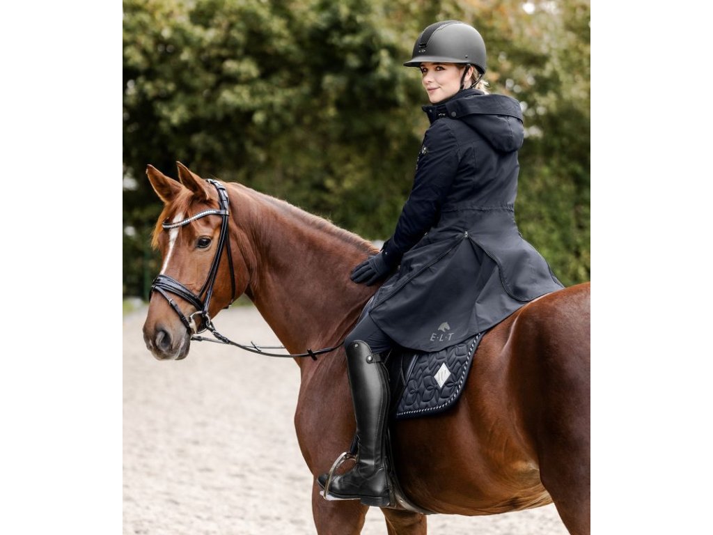 Modna i wysoce funkcjonalna zimowa kurtka jeździecka wykonana z oddychającego materiału. Kurtka jest wiatroodporna i wodoodporna (o słupie wody 5 000 mm). Dzięki wypełnieniu i uszczelnionym szwom zapewnia wspaniałe ciepło w chłodne zimowe dni. Krój jest prosty, szerokość można regulować w pasie za pomocą sznurka. Wyposażona w odpinany kaptur z regulacją szerokości i możliwością przymocowania z tyłu. Kaptur ma rozkładany daszek. Posiada wysoki kołnierz na szyi, dwukierunkowy zamek błyskawiczny z osłoną podbródka, boczne kieszenie i kieszeń wewnętrzną. Końce rękawów mają regulowaną szerokość i wewnętrzne prążkowane mankiety. Ozdobiona silikonowym nadrukiem logo E·L·T. Wewnętrzne rozcięcia do jazdy konnej mają odblaskowy nadruk logo E·L·T po lewej stronie i napis E·L·T Equestrian Performance po prawej stronie.