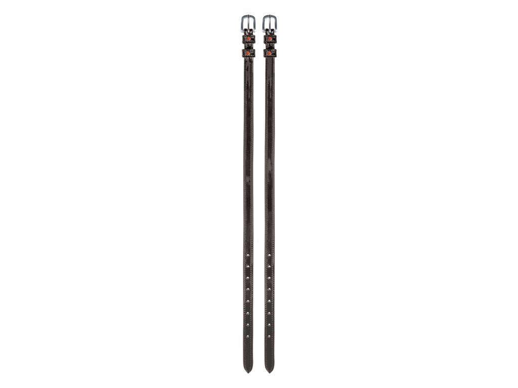 Eleganckie paski do ostróg wykonane ze skóry lakierowanej. Są ozdobione subtelnymi dżetami na szlufkach, uzupełnionymi srebrnymi okuciami. Ze względu na ich elegancki wygląd, nadają się również na zawody. Ich rozmiar można dopasować. Dostarczane w parze. Długość: 47 cm.