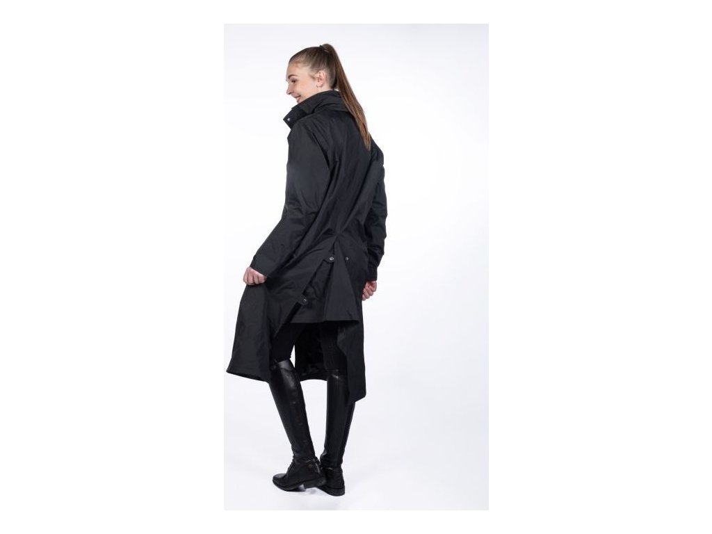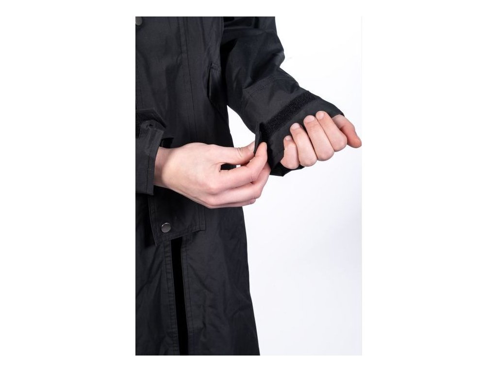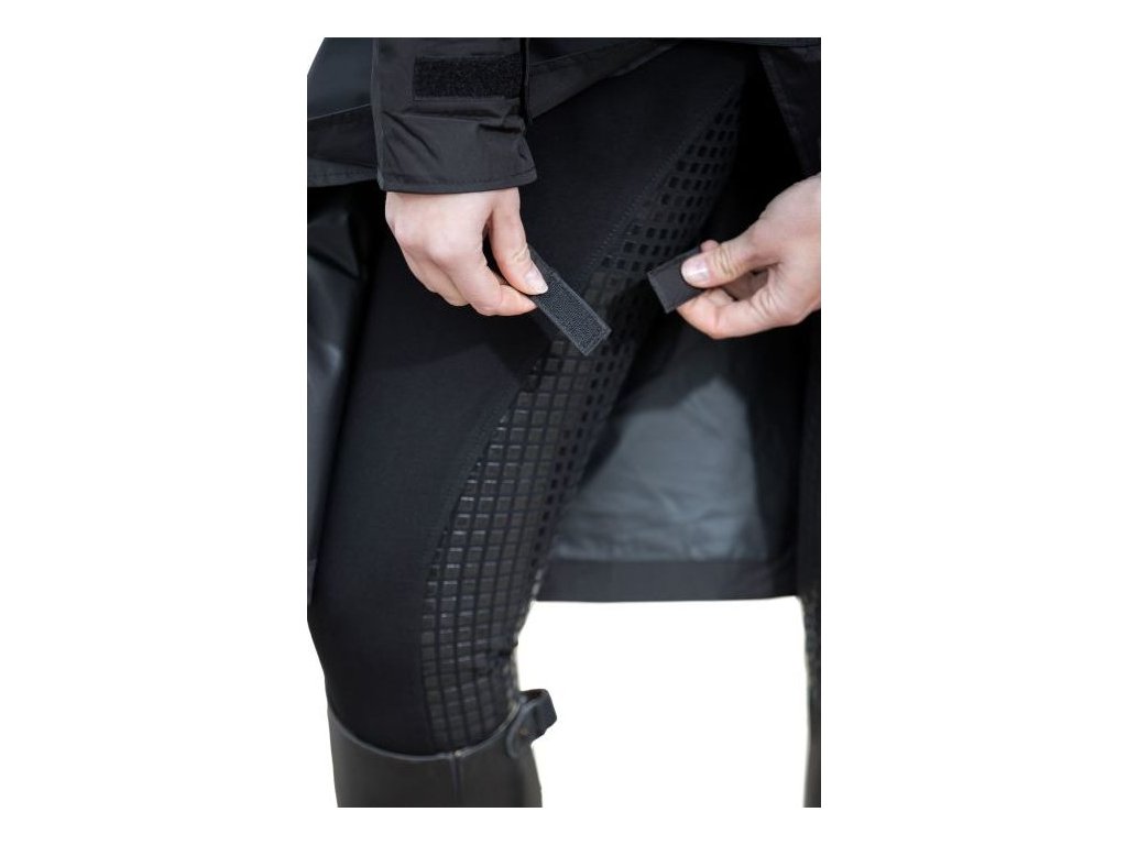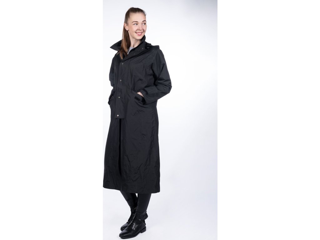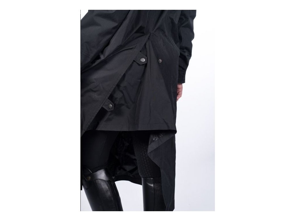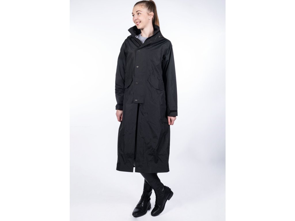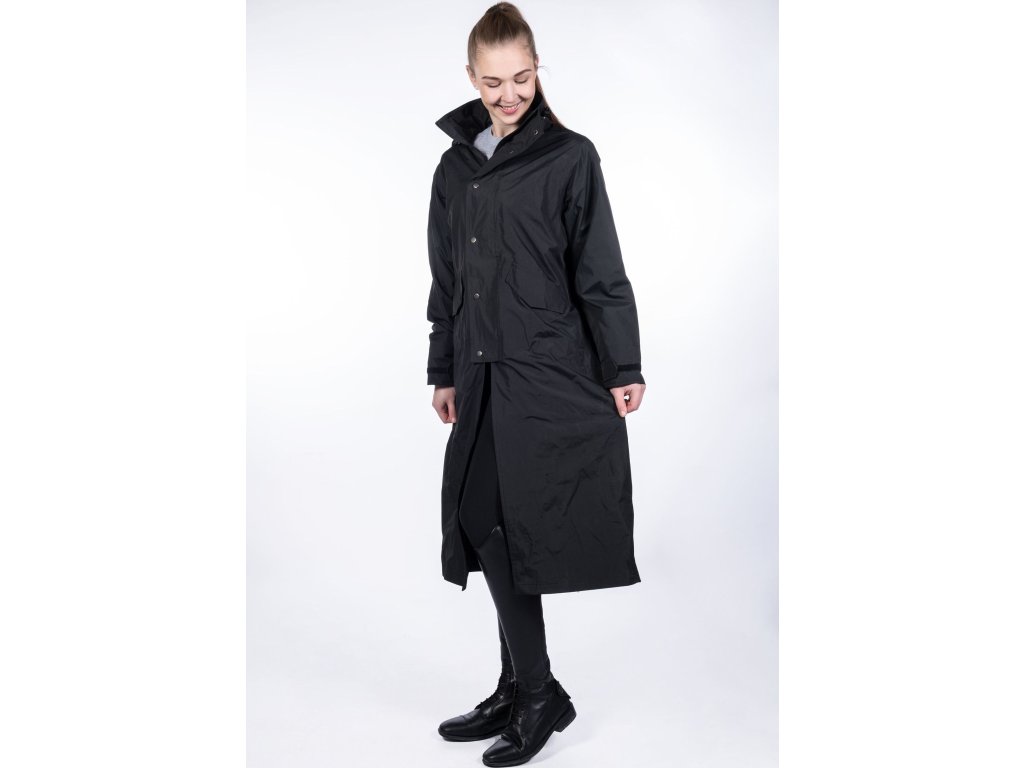 Długi płaszcz jeździecki wykonany z wiatroodpornego i wodoodpornego materiału o słupie wody 3000 mm. Wyposażony w kaptur i dwie duże kieszenie boczne. Posiada zapięcie na dwukierunkowy zamek błyskawiczny, który jest chroniony zatrzaskami. Ponadto posiada paski do mocowania wokół ud oraz tylne rozcięcie z zatrzaskami. Mankiety są regulowane za pomocą rzepów. Można prać w pralce w temperaturze 30 stopni. Dostępne w kolorze czarnym.