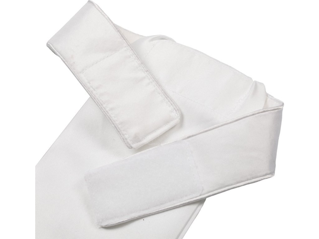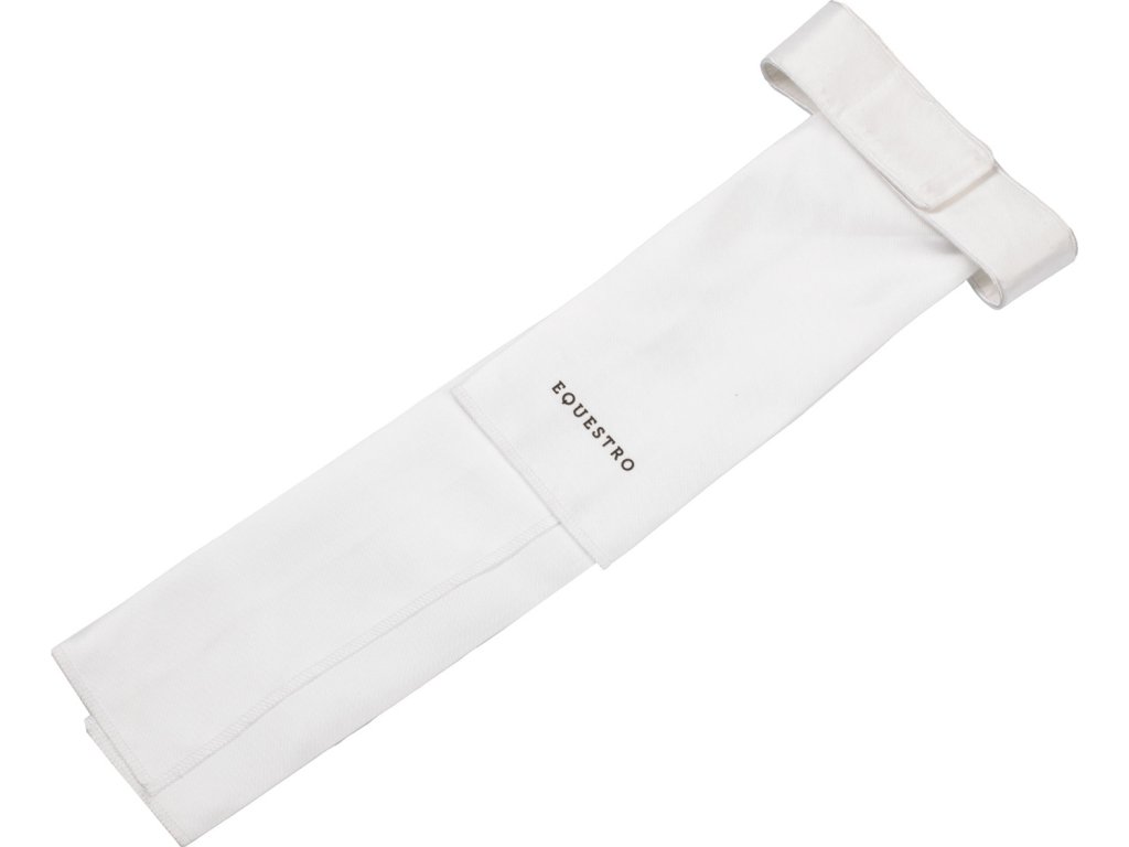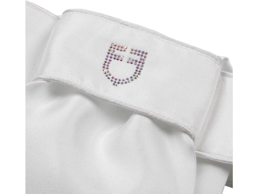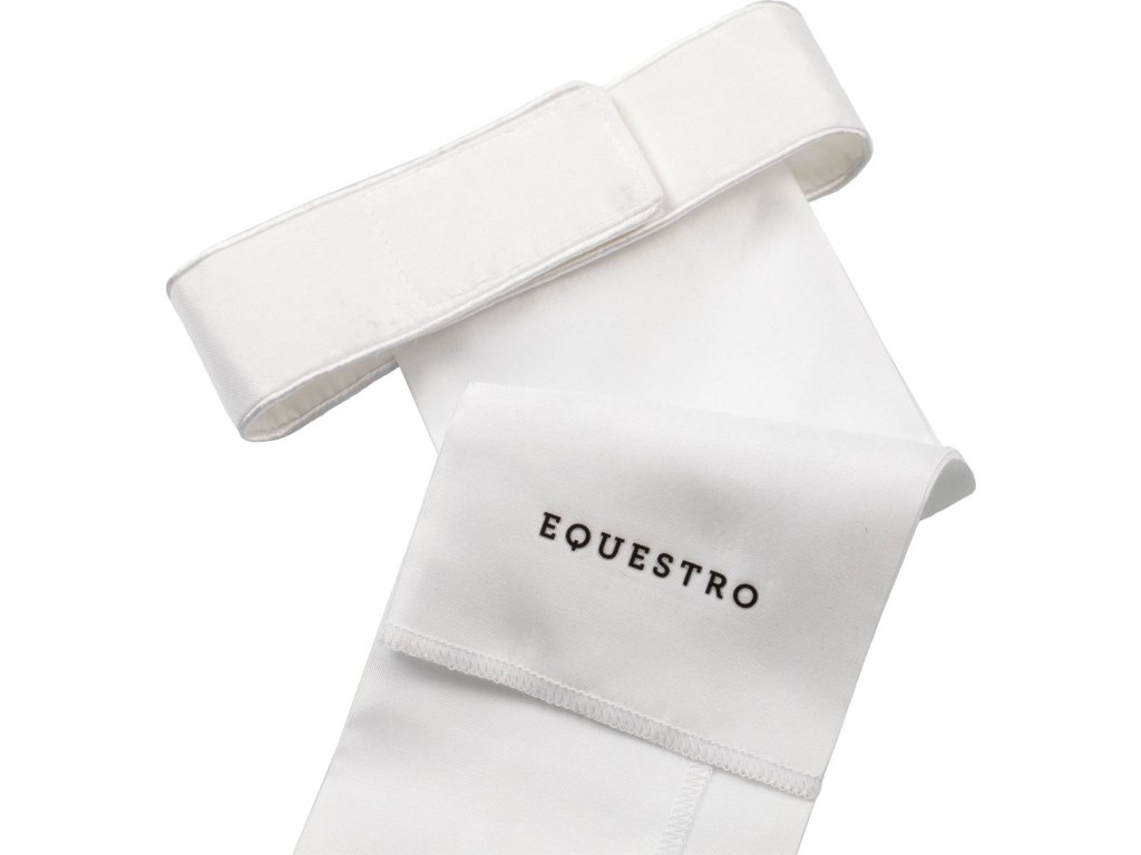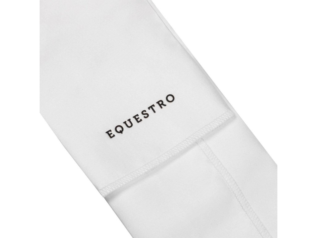 Plastron wykonany z klasycznego białego materiału technicznego jest niezbędnym dodatkiem do stroju do ujeżdżenia. Jest wyjątkowo praktyczny dzięki zapięciu na rzep pod szyją. Jest ozdobiony logo Equestro z wielokolorowymi dżetami i napisem Equestro z tyłu.