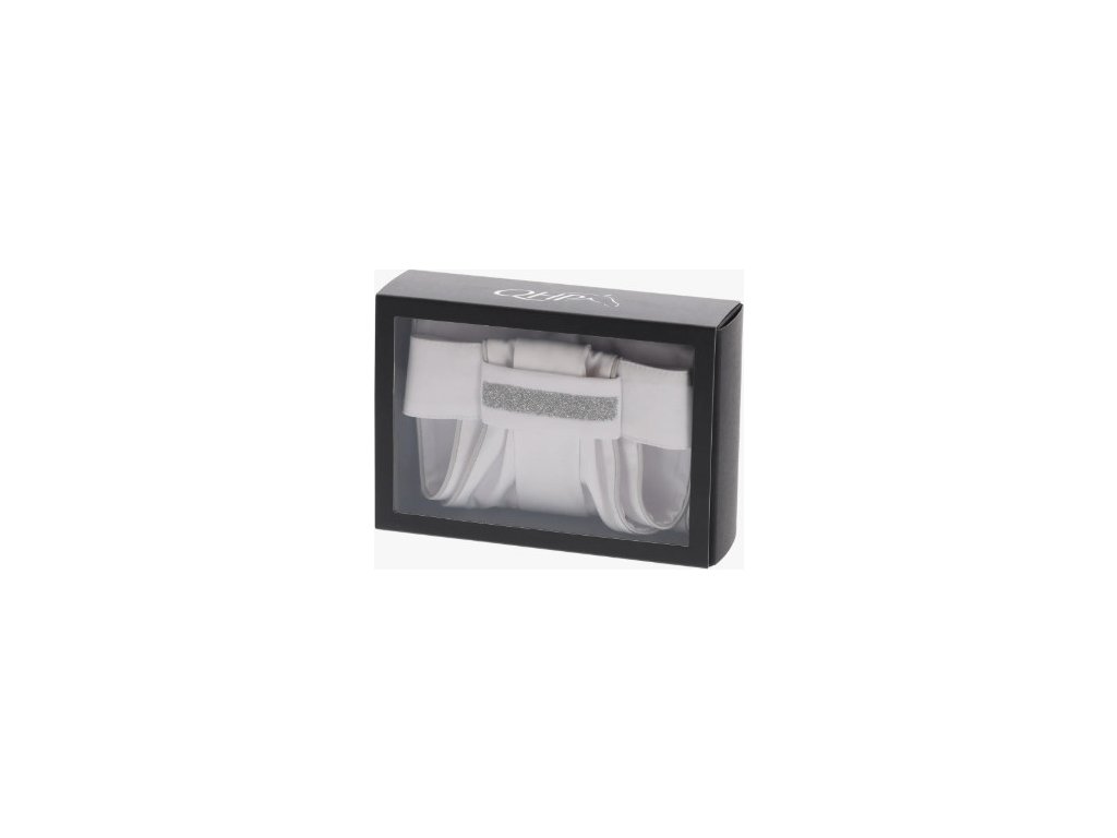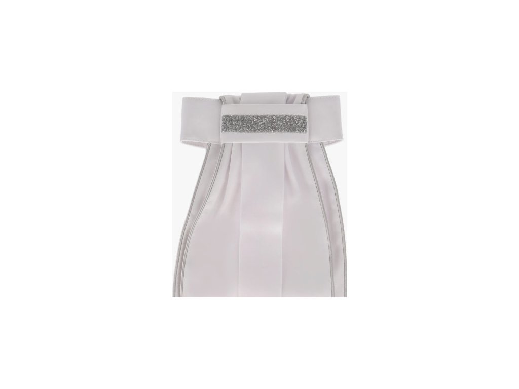 Elegancki satynowy plastron, idealny jako dodatek na zawody. Ozdobiony jest błyszczącymi, srebrnymi detalami. Łatwo zapinany na rzep.