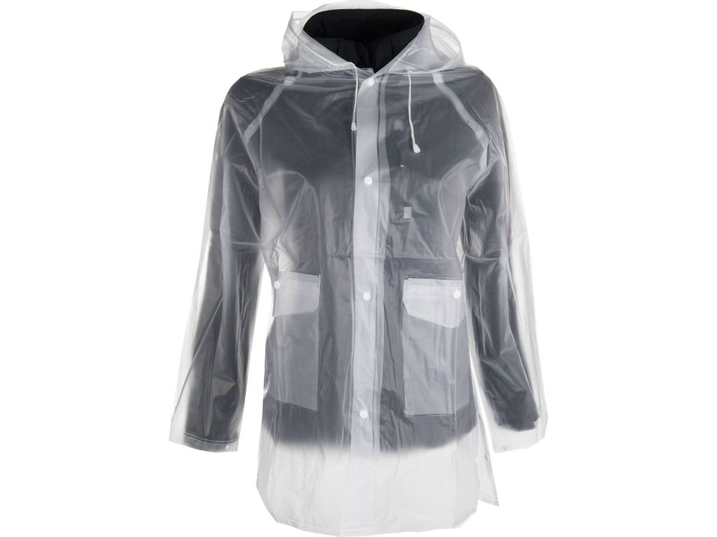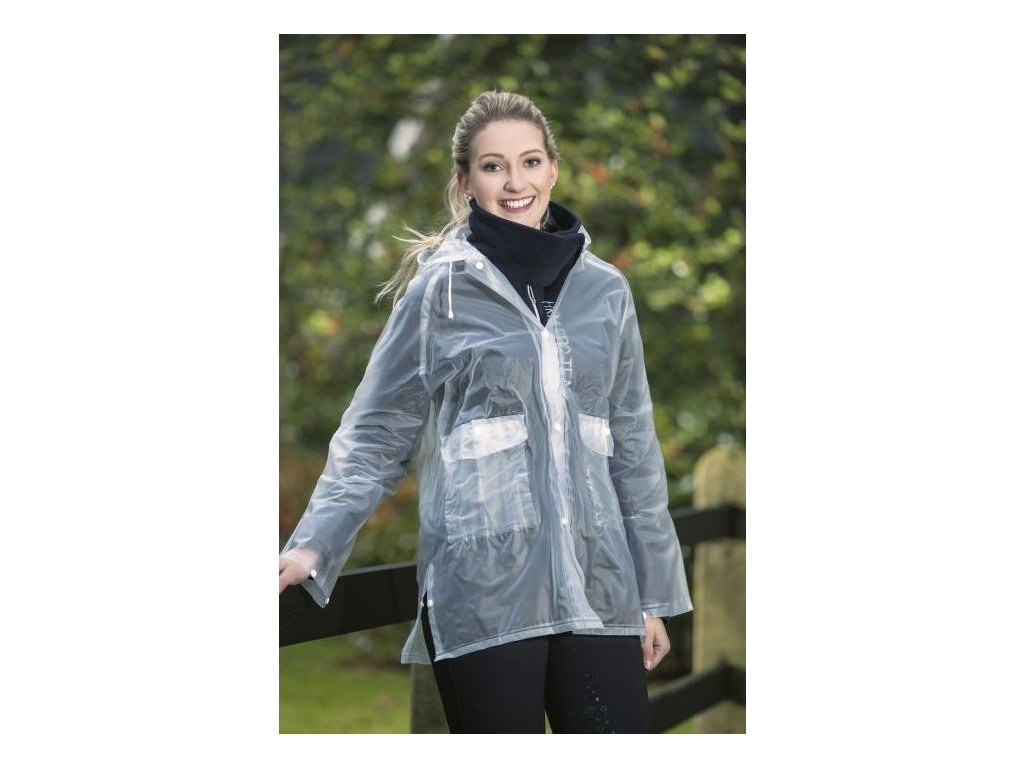 Praktyczna damska przezroczysta kurtka przeciwdeszczowa wykonana w 100% z wodoodpornego, deszczoodpornego i wiatroodpornego materiału. Zapięcie na zatrzaski ułatwia ubieranie. Klejone szwy zapewniają wysoką odporność na rozdarcia, kurtkę przeciwdeszczową można nosić na innej kurtce jeździeckiej. Zintegrowany kaptur. Można prać w pralce w temperaturze 30°C.