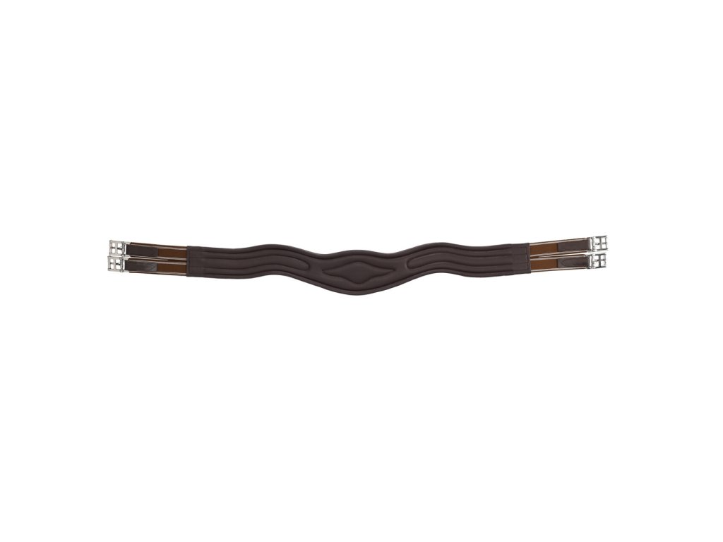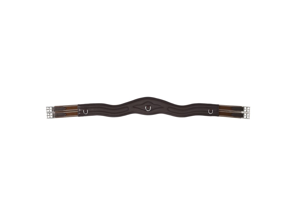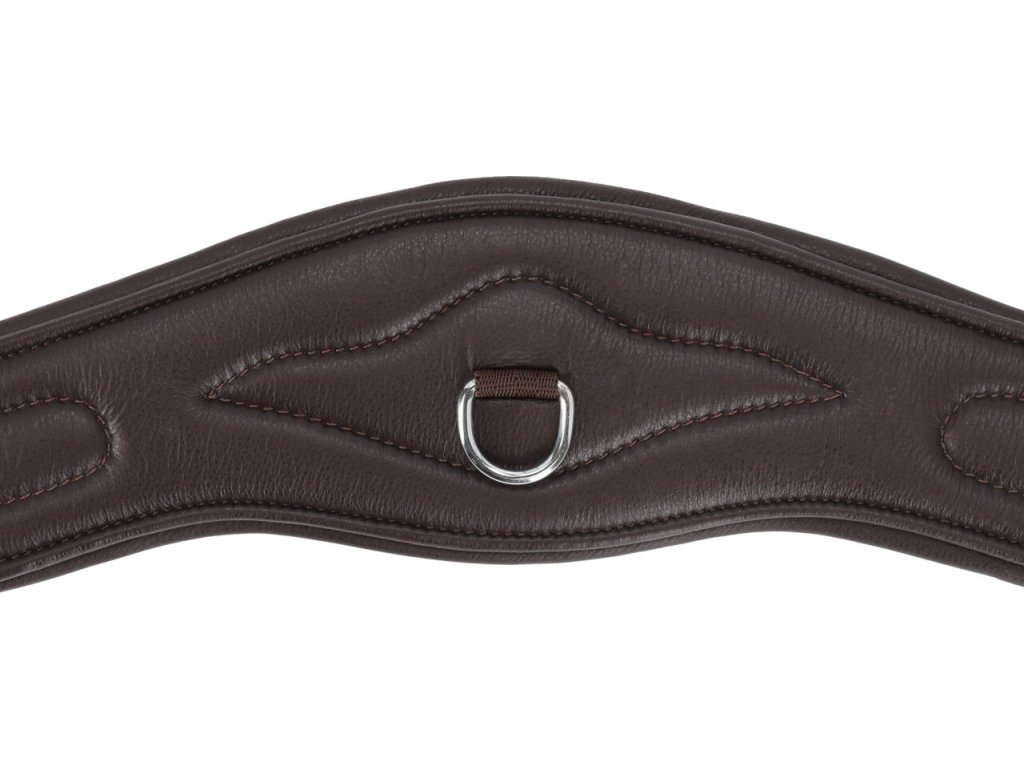 Anatomicznie ukształtowany popręg wykonany z wysokiej jakości miękkiej skóry.Popręg zapewnia maksymalny komfort i swobodę ruchów dzięki anatomicznemu kształtowi i miękkiej skórzanej wyściółce. Jest wyposażony w elastyczne gumy po obu stronach, rolkowe sprzączki i trzy pierścienie do mocowania pomocy treningowych.
