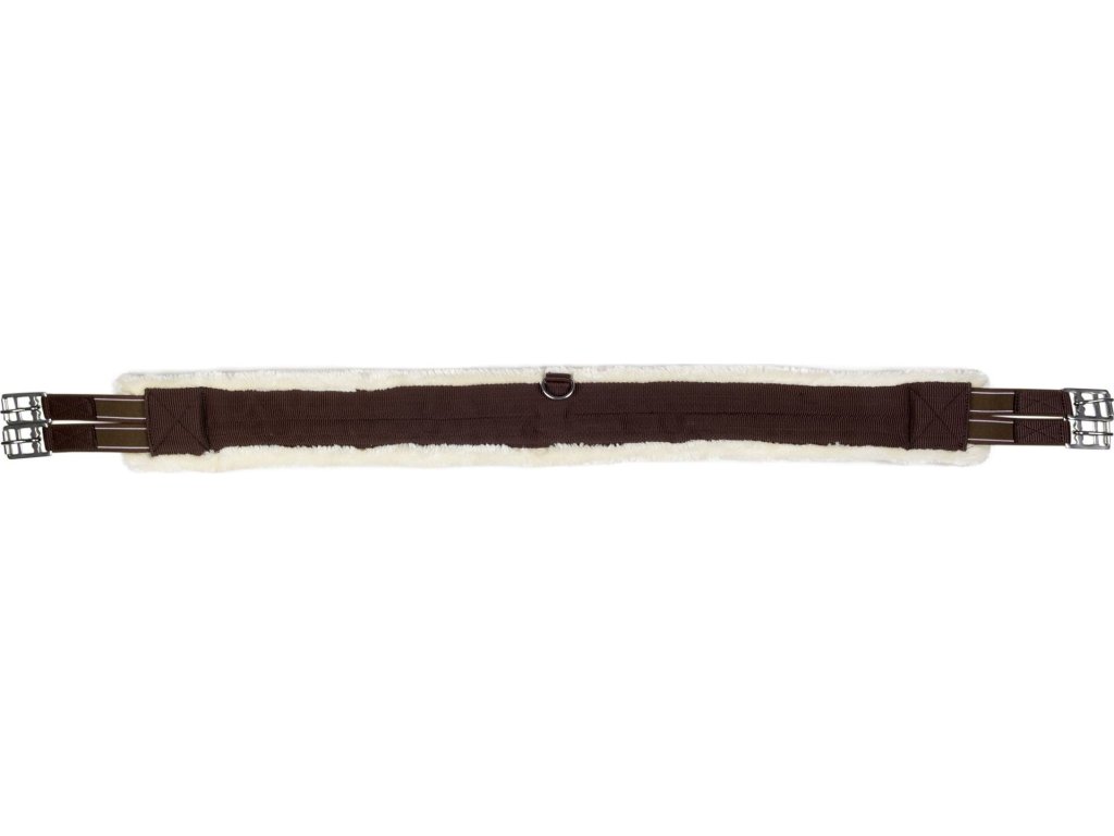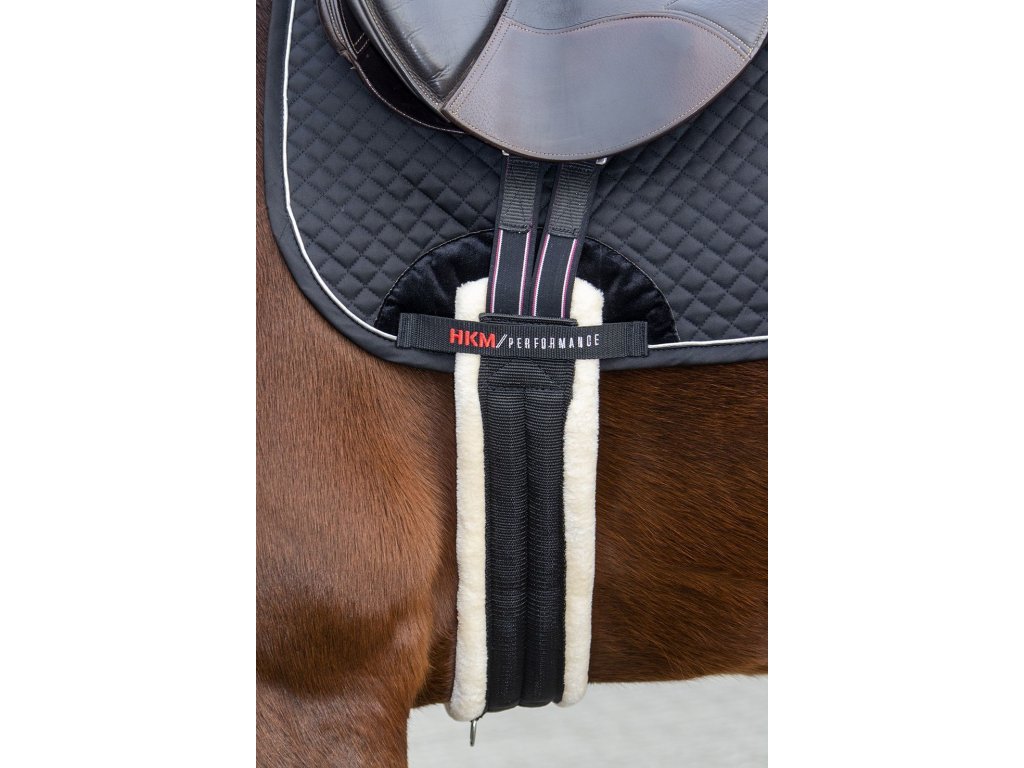 Długi tekstylny popręg HKM z bogatym syntetycznym podszyciem z jagnięcej skóry. Jest oddychający i dzięki temu pot jest szybko odprowadzany od konia. Miękka jagnięca skóra chroni konia przed otarciami, dzięki czemu nadaje się nawet dla wrażliwych koni. Popręg jest wyposażony w elastyczne gumy po obu stronach. Wyposażony w centralny D-ring do szybkiego mocowania pomocy treningowych. Dostępny w wielu rozmiarach.