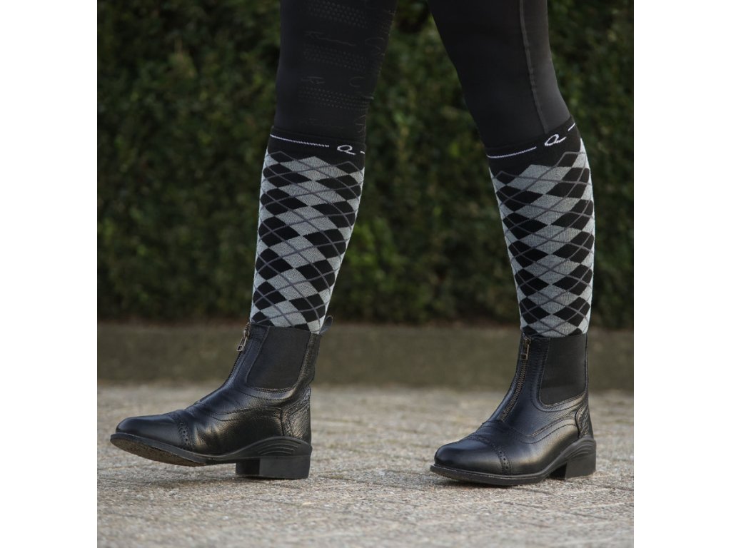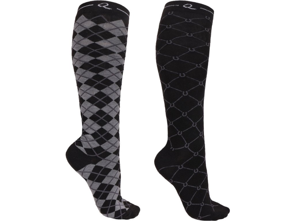 Podkolanówki jeździeckie, dostarczane w zestawie dwóch par. Zestaw zawiera dwie pary skarpet z przyciągającym wzrok wzorem. Wykonane są z wysoce elastycznego materiału dla maksymalnego komfortu.