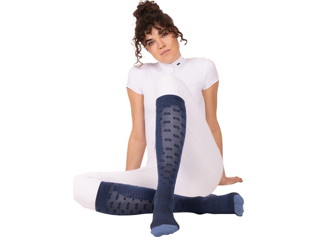 Wysokiej jakości jeździeckie podkolanówki CompressTEQ z średnio-niską kompresją. Kompresja stymuluje krążenie krwi i sprawia, że nogi są mniej zmęczone po jeździe. Materiał wokół kostek i na stopie jest wzmocniony, aby zapewnić maksymalną wytrzymałość i wsparcie. Wykonane z materiału Dryarn®, który jest miękki, oddychający, szybko odprowadza wilgoć i zapobiega otarciom. Ozdobione haftowanymi logotypami PresTeq. Dostępna w kolorze niebieskim i czarnym.
