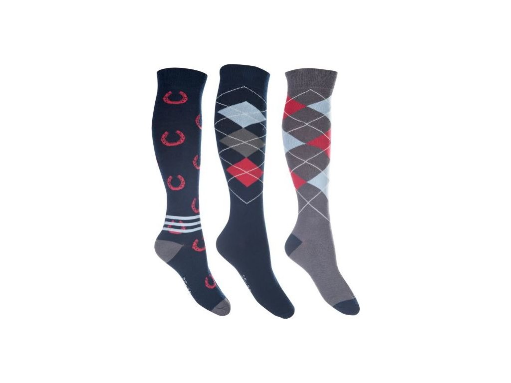 Zestaw 3 par skarpet jeździeckich HKM w różnych kombinacjach kolorów i wzorów. Dzięki wysokiej zawartości bawełny są miękkie i bardzo wygodne. Jednocześnie są oddychające, dzięki czemu zapewniają wysoki komfort noszenia. Można prać w pralce w temperaturze 30°C w programie do tkanin delikatnych. Dostępne w różnych kombinacjach kolorystycznych.