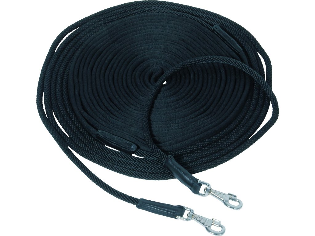 Nylonowa podwójna lonża z elementami w kolorze złota, okrągła część przechodząca przez uprząż. Wygodna płócienna część prowadząca do ręki, mocowanie na karabińczyki wzmocnione skórą. Długość 16 i 18 m.