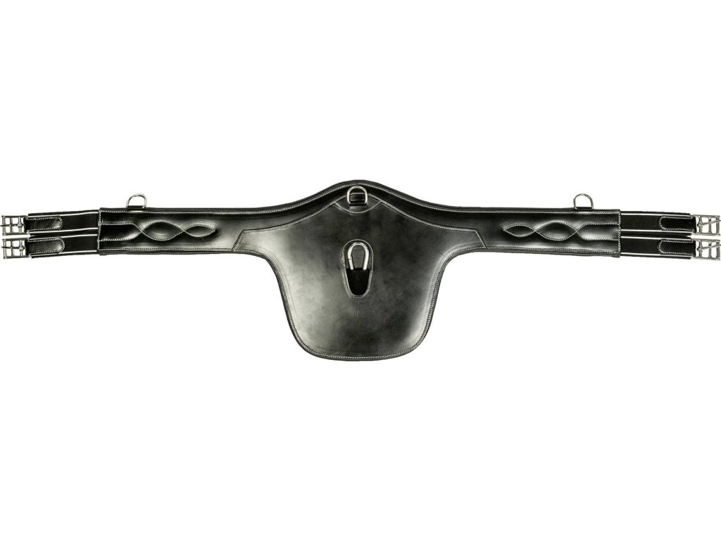 Wysokiej jakości popręg HKM z fartuchem, ozdobiony białymi przeszyciami. Dla doskonałej funkcjonalności, jest anatomicznie ukształtowany i wykonany z wysokiej jakości skóry. Dodatkowo, jest wyposażony w napinające gumy po obu stronach, dla maksymalnego komfortu i elastyczności. Dla łatwego mocowania pomocy treningowych, posiada karabińczyk i kółko D na środku oraz dwa kółka D po bokach. Dostępne w kolorze brązowym i czarnym.