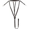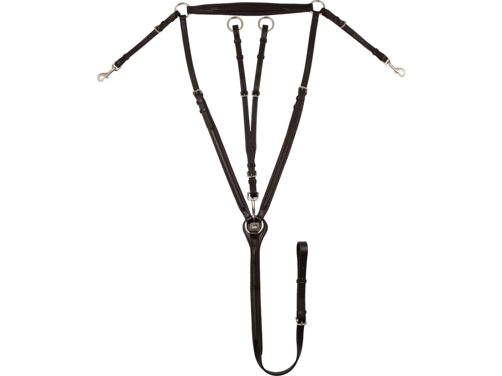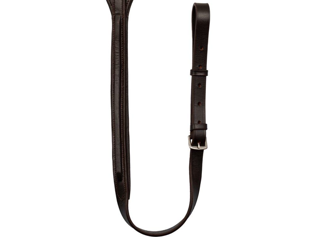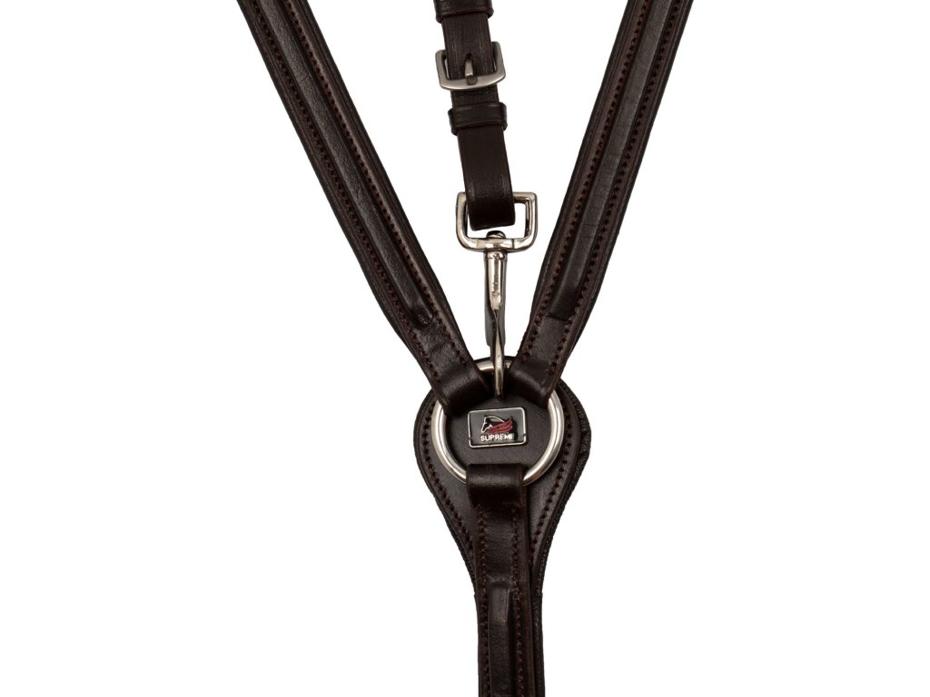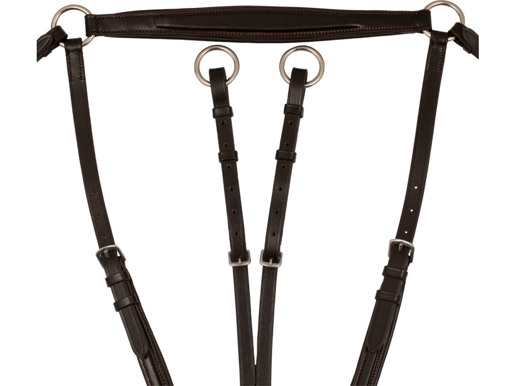 Wysokiej jakości trzypunktowy napierśnik wykonany ze skóry cielęcej. Wyposażony w odpinany widelec wytokowy. Utrzymuje siodło we właściwej pozycji i zapobiega jego przesuwaniu się w okolice lędźwiowe. Wyściółka zapewnia maksymalny komfort. Wyposażony w okucia ze stali nierdzewnej. Dostępne również w kolorze czarnym. Dostępny w rozmiarach Pony, Cob i Full.