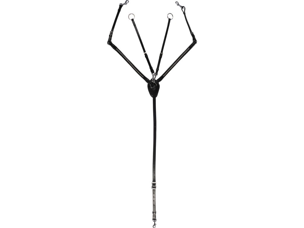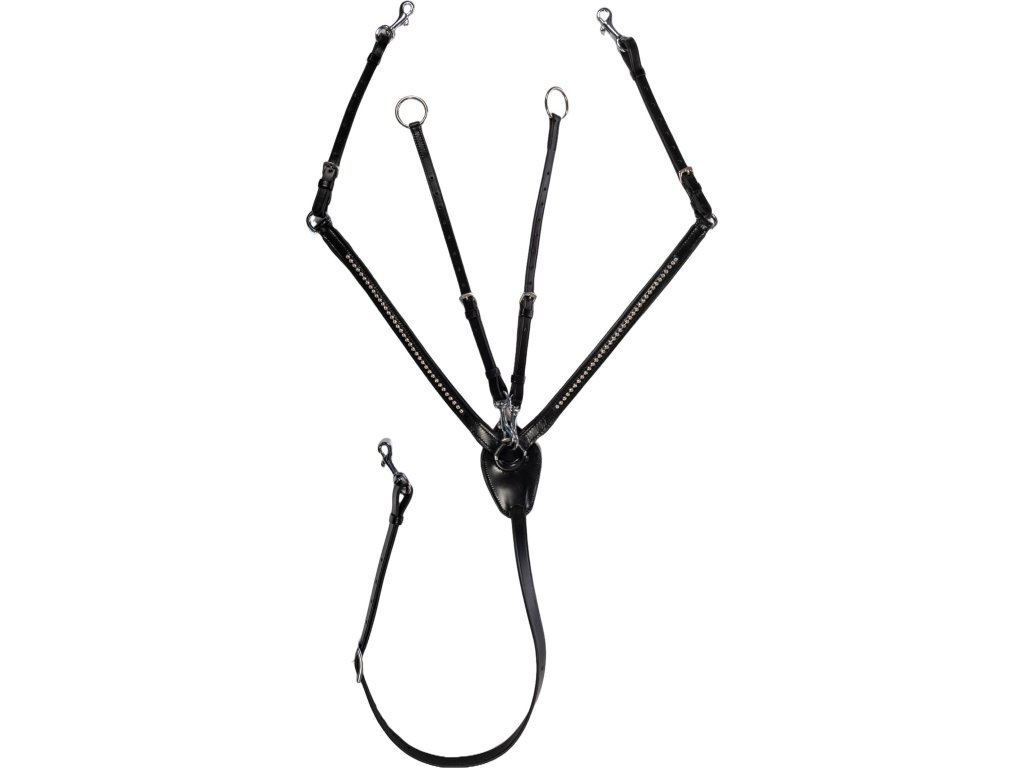 Trzypunktowy napierśnik wykonany z wysokiej jakości skóry o długiej żywotności. Punkty nacisku są miękko wyściełane. Ozdobiony drobnymi kryształkami. Wyposażony w wysokiej jakości okucia w kolorze srebrnym. Widelec do wytoku można zdjąć za pomocą karabińczyków.