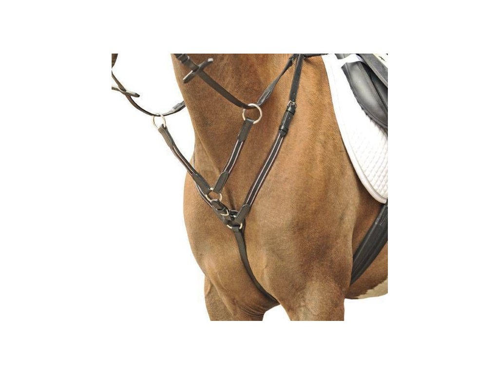 Trzypunktowy napierśnik wykonany z wysokiej jakości skóry. Wyposażony w odpinany widelec wytokowy. Elastyczne paski zapewniają większą swobodę ruchów i komfort dla konia. Okucia są w srebrnym kolorze. Dostępne w kolorze czarnym i brązowym. Dostępny w rozmiarach PONY, COB i FULL.