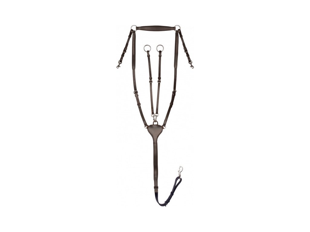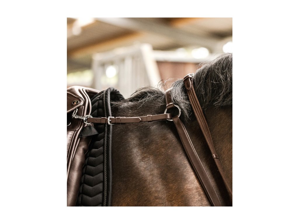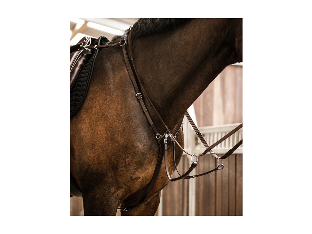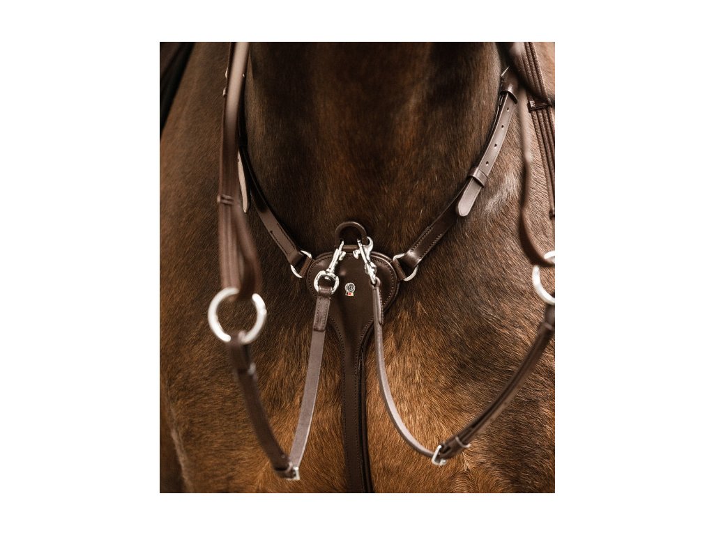 Wysokiej jakości napierśnik z elastyczną wstawką na szyi i odpinanym widelcem do wytoku. Wykonany z wysokiej jakości skóry i ozdobiony eleganckimi przeszyciami. Okucia ze stali nierdzewnej.