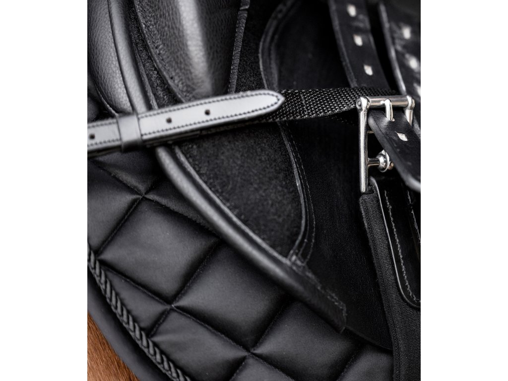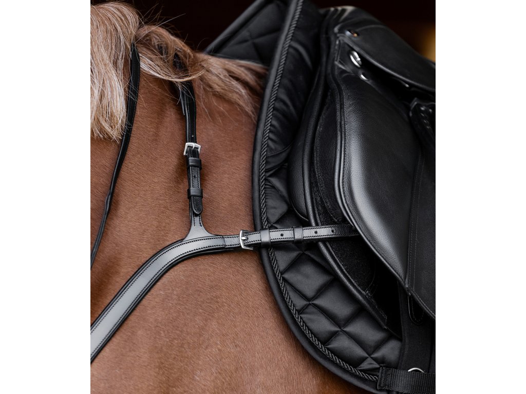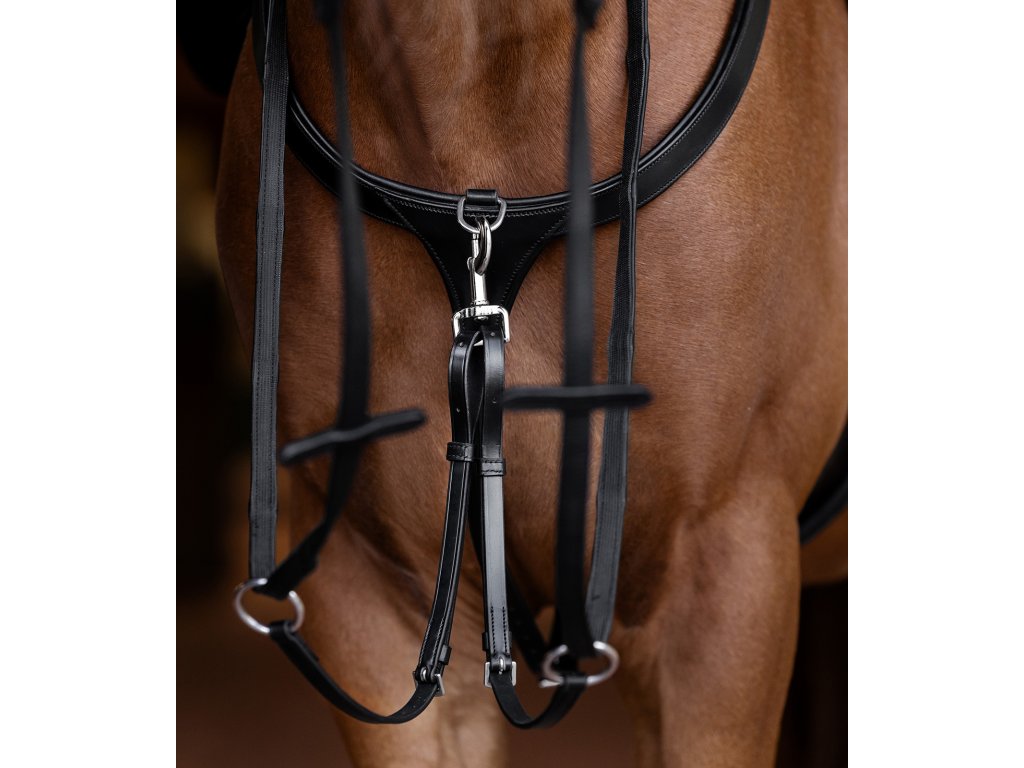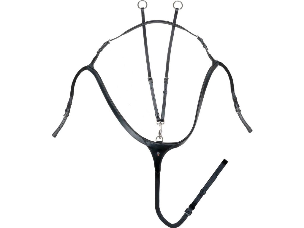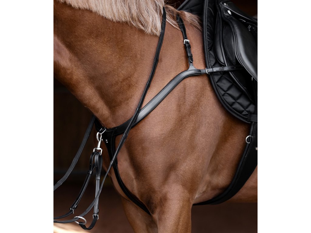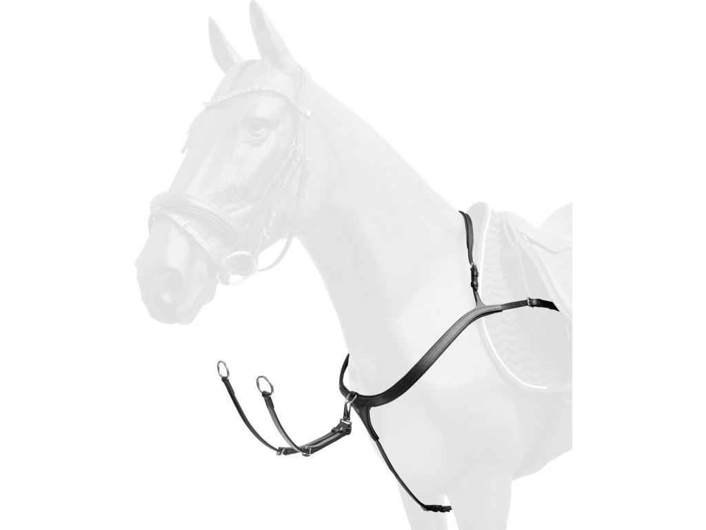 Trzypunktowy wysokiej jakości skórzany napierśnik z odpinanym widelcem do wytoku. Napierśnik ma anatomiczny krój, który zapewnia nieograniczoną swobodę ruchów, a jednocześnie zapobiega przesuwaniu się siodła. Część, która przechodzi przez popręg, jest regulowana. Posiada wysokiej jakości okucia ze stali nierdzewnej i elastyczne wstawki dla wysokiego komfortu. Napierśnik z serii X-line łączy w sobie stabilność i komfort.