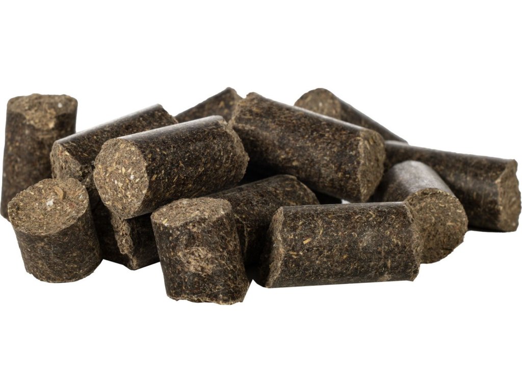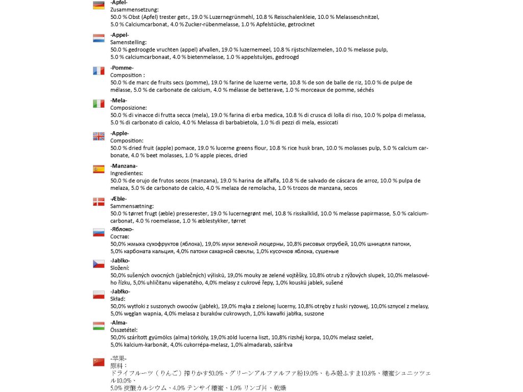 | Složení: | Složení: 50% sušených ovocných (jablečných) výlisků, 19% mouky ze zelené vojtěšky, 10,8% otrub z rýžových slupek, 10% melasového řízku, 5% uhličitanu vápenatého, 4% melasy z cukrové řepy, 1% kousků jablek. |