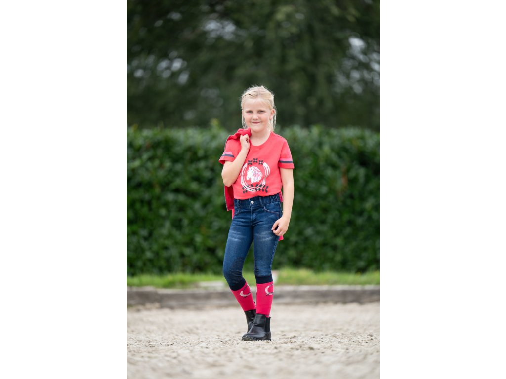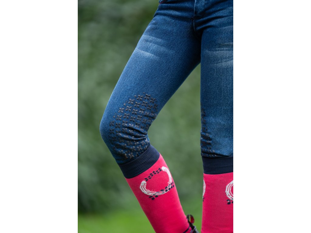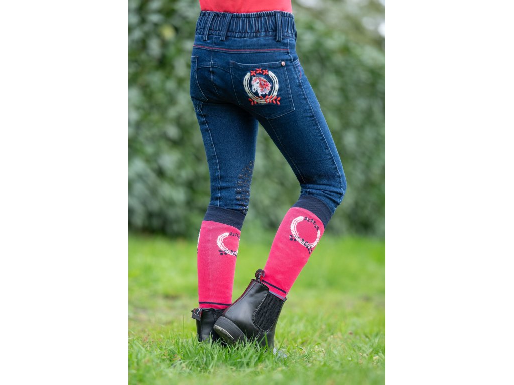 Bryczesy jeździeckie dziecięce o wyglądzie jeansu. Wyposażone w silikonowy lej na kolanach. Wysoka zawartość bawełny zapewnia wyjątkowy komfort, a zawartość elastanu doskonałą swobodę ruchów. Wyposażone w przednie i tylne kieszenie oraz elastyczne zakończenia nogawek, które ułatwiają zakładanie i zdejmowanie. Ozdobione aplikacją z głową konia na tylnej kieszeni. Można prać w pralce w temperaturze 30°C w programie do tkanin delikatnych.