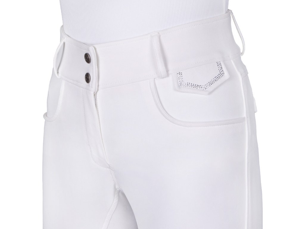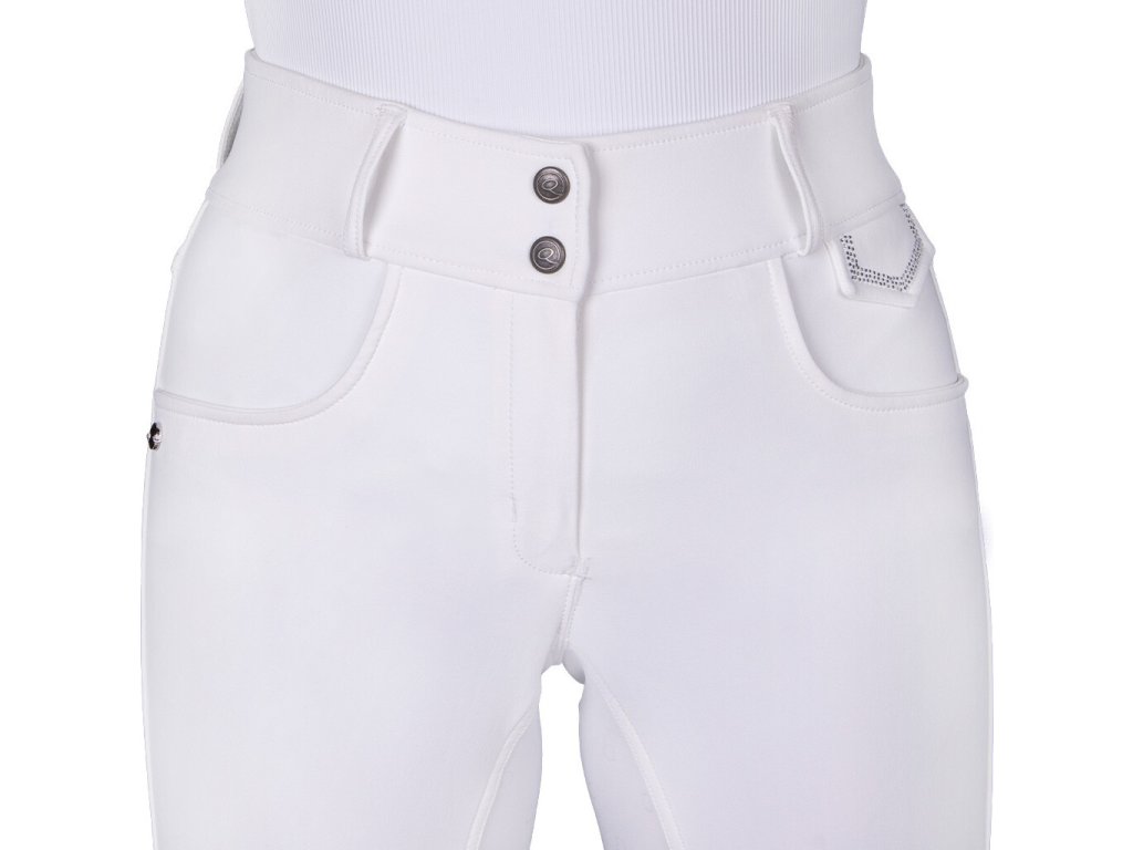 Wysokiej jakości bryczesy damskie z silikonowym antypoślizgowym lejem na całej długości, zapewniającym doskonałą przyczepność. Wykonane z rozciągliwego, oddychającego materiału. Posiadają klasyczne szlufki na pasek, a tył jest zaprojektowany z pętelkami w kształcie litery V. Nogawki są wykończone Lycrą. Kieszenie są ozdobione cyrkoniami, co dodaje eleganckiego wyglądu. Kieszenie są wyłącznie ozdobne. Bryczesy nadają się do noszenia przez cały rok i są również dostępne w kolorze czarnym. Idealnie pasuje do innych produktów z kolekcji Djune.