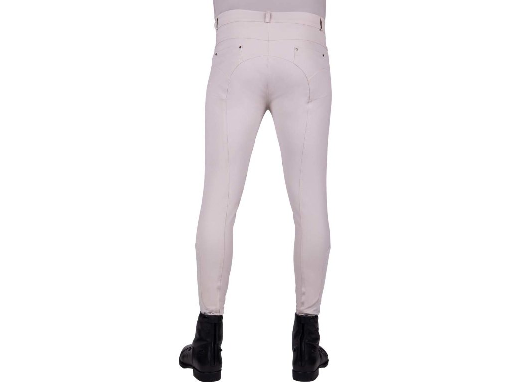 Bryczesy męskie z silikonowym, antypoślizgowym lejem. Wykonane z miękkiego i bardzo wygodnego materiału. Wyposażone w dwie kieszenie z tyłu i z przodu, małą kieszonkę na monety i lycrę na nogawkach. Ozdobione małym metalowym emblematem QHP po lewej stronie. Dostępne również w innych wariantach kolorystycznych. Część kolekcji jesień/zima 2023/2024.