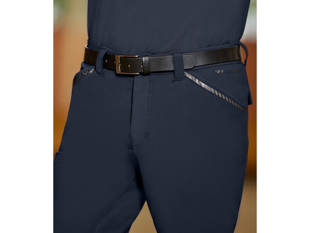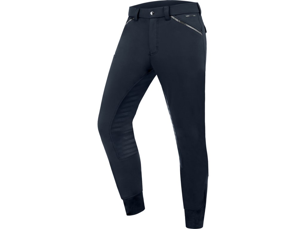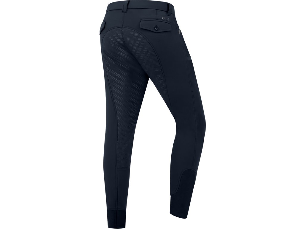 Męskie bryczesy do jazdy konnej z pełnym lejem i efektem kompresji. Elastyczne końcówki nogawek zapewniają komfort i łatwe zakładanie. Wysoce elastyczny, stabilny wymiarowo i oddychający materiał. Dwie przednie kieszenie bez zapięcia, tylko klapki z guzikiem z tyłu.