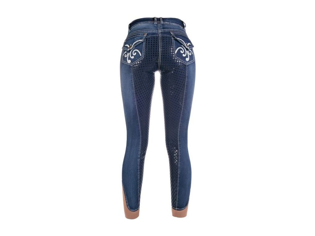 Wygodne bryczesy jeździeckie Pasadena Summer Denim o dżinsowym wyglądzie firmy HKM. Bryczesy są wyposażone w elastyczne zakończenie nogawek, co ułatwia ich zakładanie i zdejmowanie. Wykonane z komfortowego i elastycznego materiału, idealnego na lato. Posiadają dwie kieszenie z przodu i dwie z tyłu. Wyposażone w silikonowy grip na całej długości siedziska i szlufki na pasek. Można prać w pralce w temperaturze 30°C i suszyć w suszarce bębnowej na zimnym powietrzu. Bryczesy do rozmiaru 158 są wyposażone w regulowaną szerokość w pasie.
