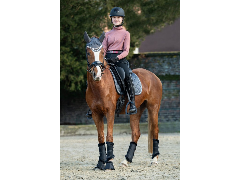 Dziecięce zimowe bryczesy wykonane z wysokiej jakości materiału, który ma zdolność do utrzymywania ciepła dzięki lekkiej polarowej podszewce. Elastyczne końcówki nogawek zapewniają większy komfort, a silikonowy lej na całym siedzisku zapewnia doskonałą przyczepność do siodła. Tylne kieszenie pełnią funkcję dekoracyjną, a dwie boczne kieszenie są idealne do przechowywania telefonu lub smakołyków.