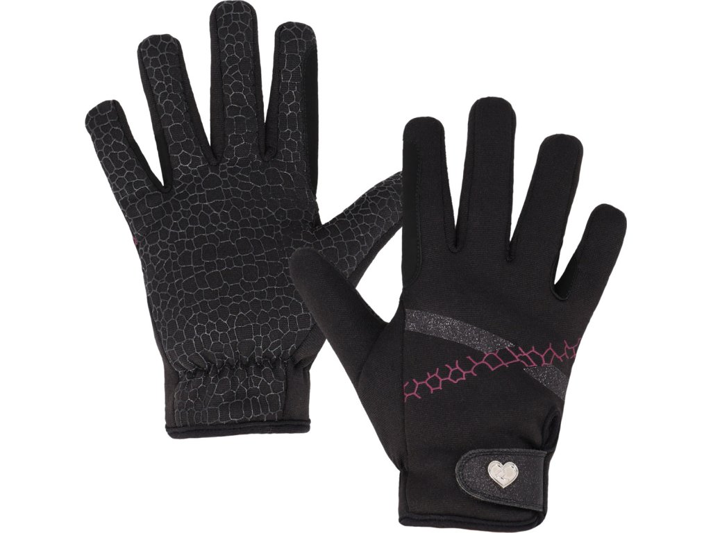 Dziecięce rękawiczki jeździeckie Lize, które zachwycają pięknym designem. Zapewniają pewny chwyt dzięki specjalnemu materiałowi na dłoniach. Zapięcie na rzep jest ozdobione brokatem i uroczym logo producenta w kształcie serca. Dla większej trwałości rękawiczki mają wzmocniony materiał między palcem serdecznym a małym, a także między palcem wskazującym a kciukiem.