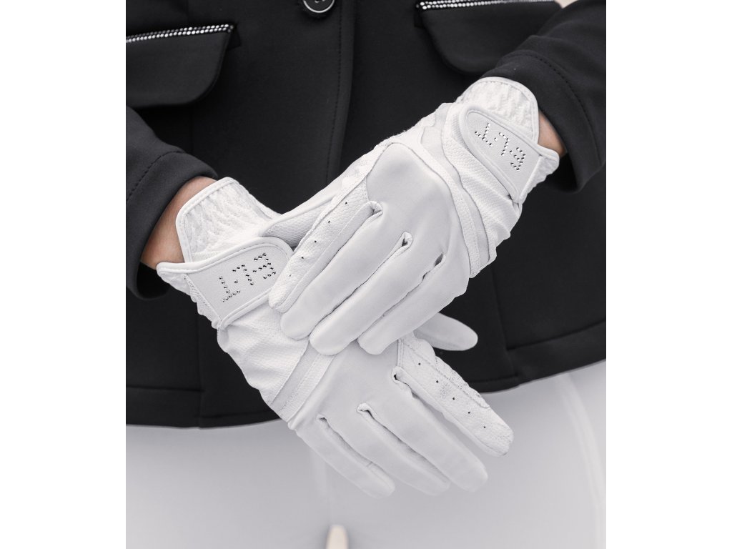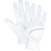 Rękawiczki jeździeckie z elastycznego materiału na grzbiecie dłoni i kciuku zapewniające wygodne noszenie. Ozdobione brokatowym paskiem i logo ELT z dżetów.Elastyczne mankiety i specjalny materiał na kciuku i palcu wskazującym zapewniają komfortową obsługę telefonu bez konieczności zdejmowania rękawic. Wzmocnione w obszarze trzymania wodzy i wyposażone w zapięcie na Velcro.