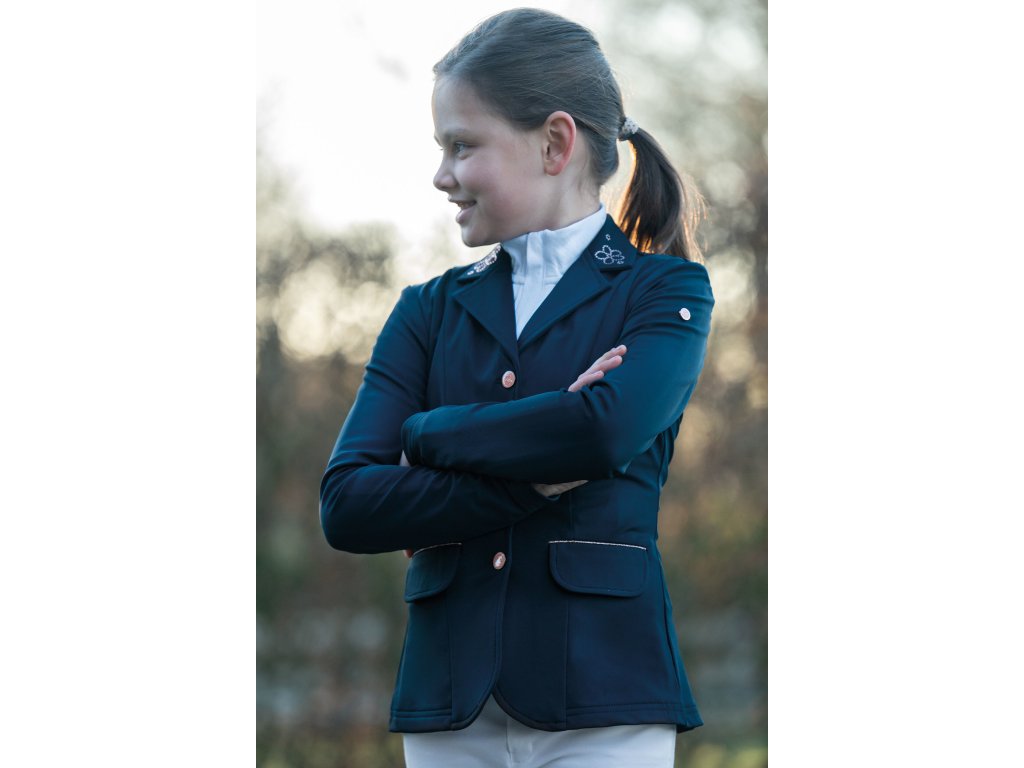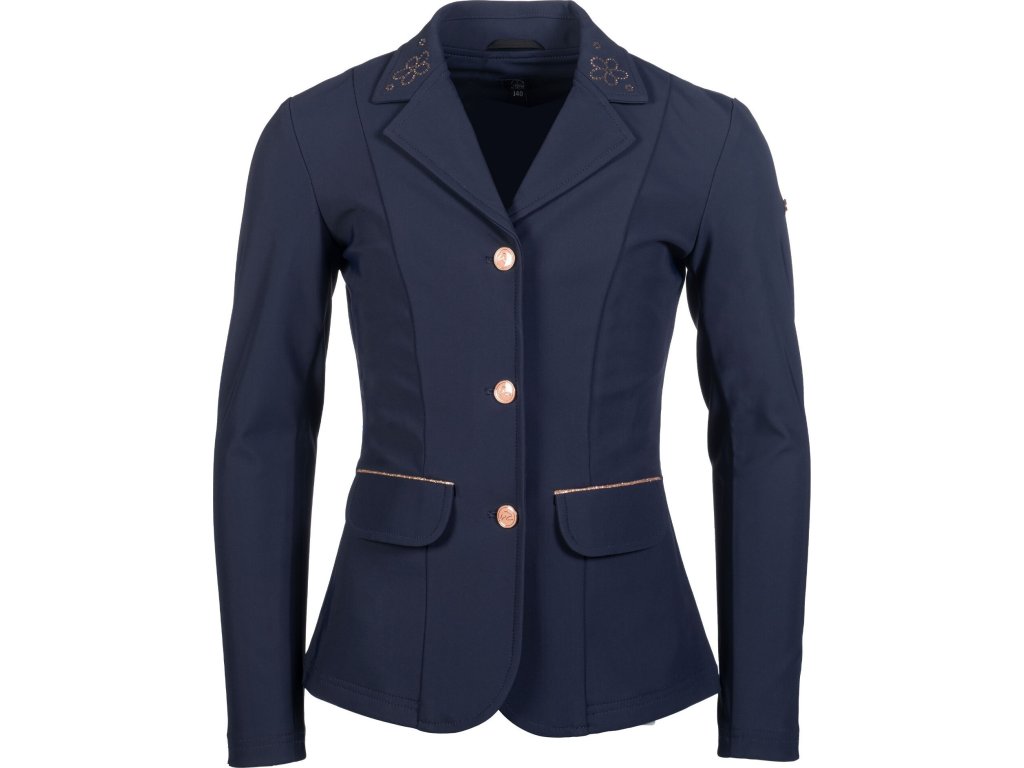 Bardzo wysokiej jakości kurtka konkursowa wykonana z materiału odpornego na zabrudzenia i niegniotącego się. Kurtka jest bardzo wygodna i świetnie leży. Wyposażona w zapięcie na guziki w kolorze rosegold, z ukrytym zamkiem błyskawicznym pod spodem. Z dwiema bocznymi kieszeniami i rozcięciami z tyłu. Delikatne cyrkonie, ułożone we wzór kwiatowy, zdobią kołnierz i tył kurtki. Dostępne w dwóch kolorach.