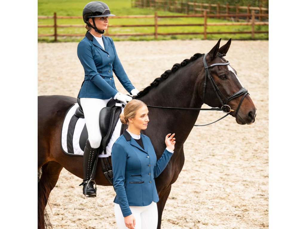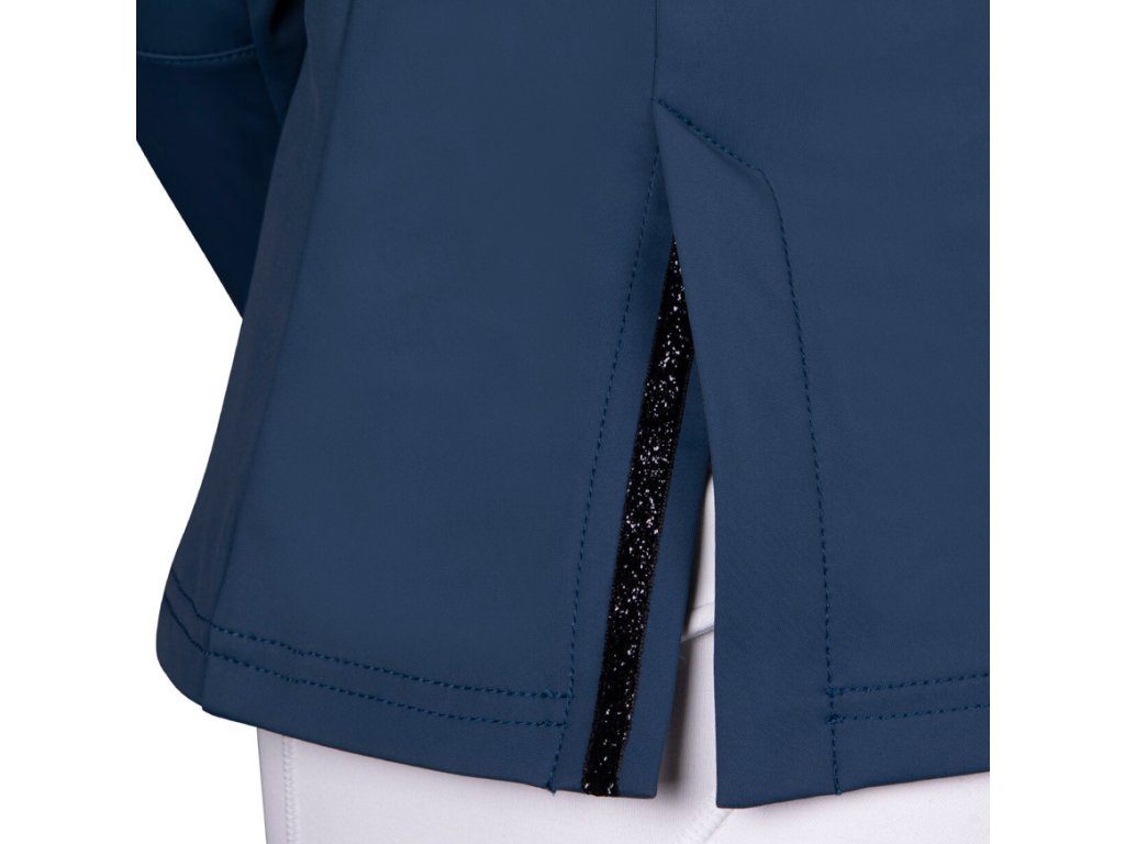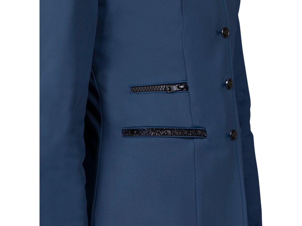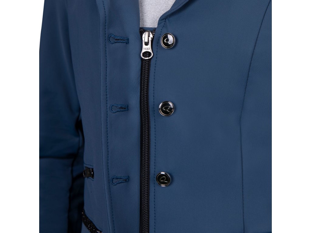 Elegancka kurtka konkursowa wykonana z oddychającego, rozciągliwego w czterech kierunkach materiału, który zapewnia komfort podczas jazdy. Zastosowany materiał jest wodoodporny. Kurtka ma zapięcie na zamek błyskawiczny zakryte guzikami. Czarna, błyszcząca lamówka wokół kieszeni dodaje kurtce eleganckiego charakteru. Frak posiada również małą, praktyczną kieszeń na zamek i czarny kołnierz. Guziki są ozdobione logo "Q". Można prać w pralce.