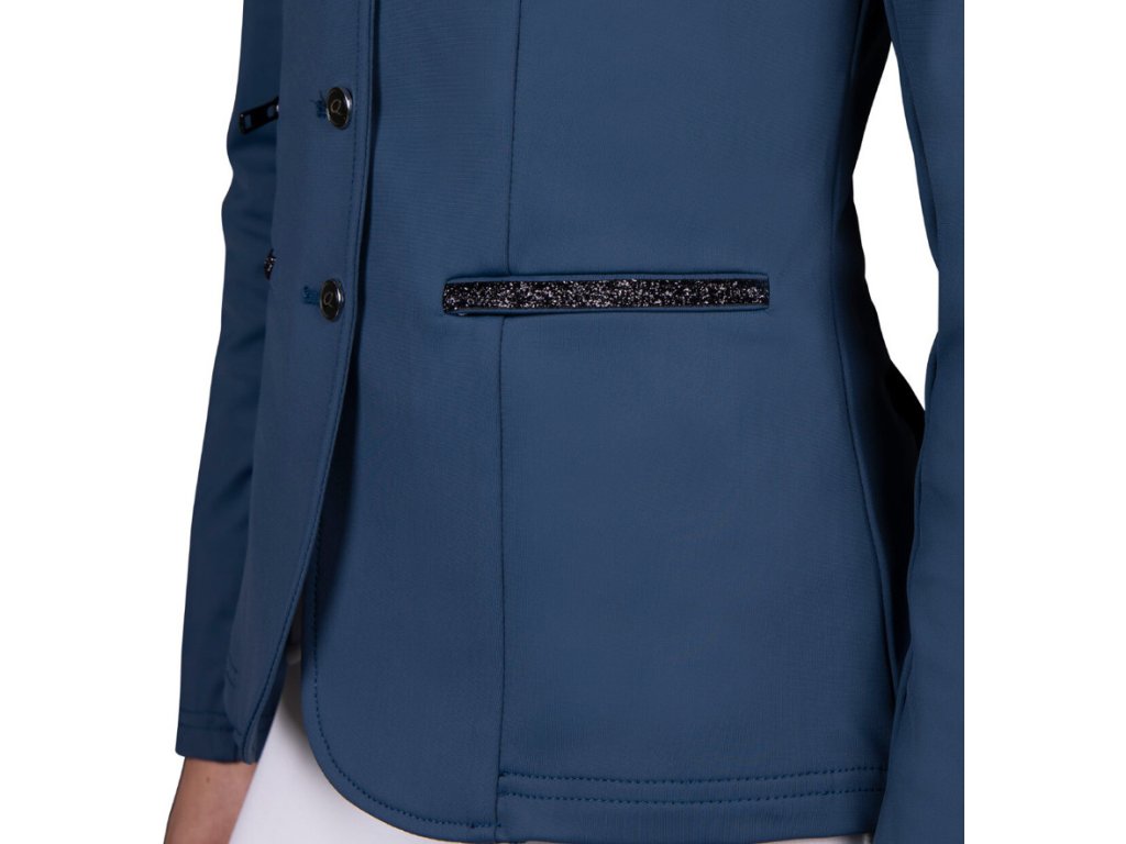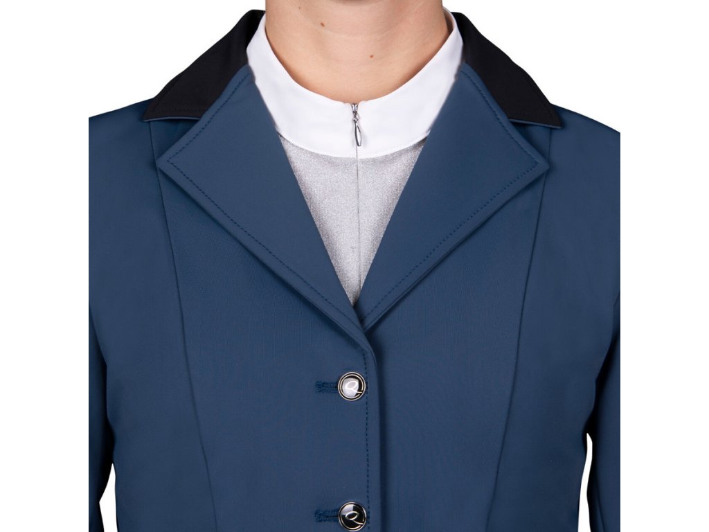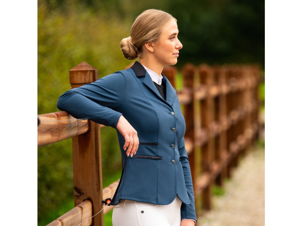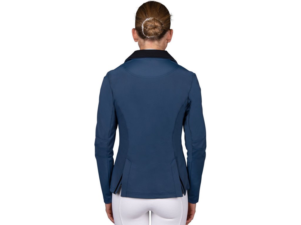 Elegancka kurtka konkursowa wykonana z oddychającego, rozciągliwego w czterech kierunkach materiału, który zapewnia komfort podczas jazdy. Zastosowany materiał jest wodoodporny. Kurtka ma zapięcie na zamek błyskawiczny zakryte guzikami. Czarna, błyszcząca lamówka wokół kieszeni dodaje kurtce eleganckiego charakteru. Frak posiada również małą, praktyczną kieszeń na zamek i czarny kołnierz. Guziki są ozdobione logo "Q". Można prać w pralce.