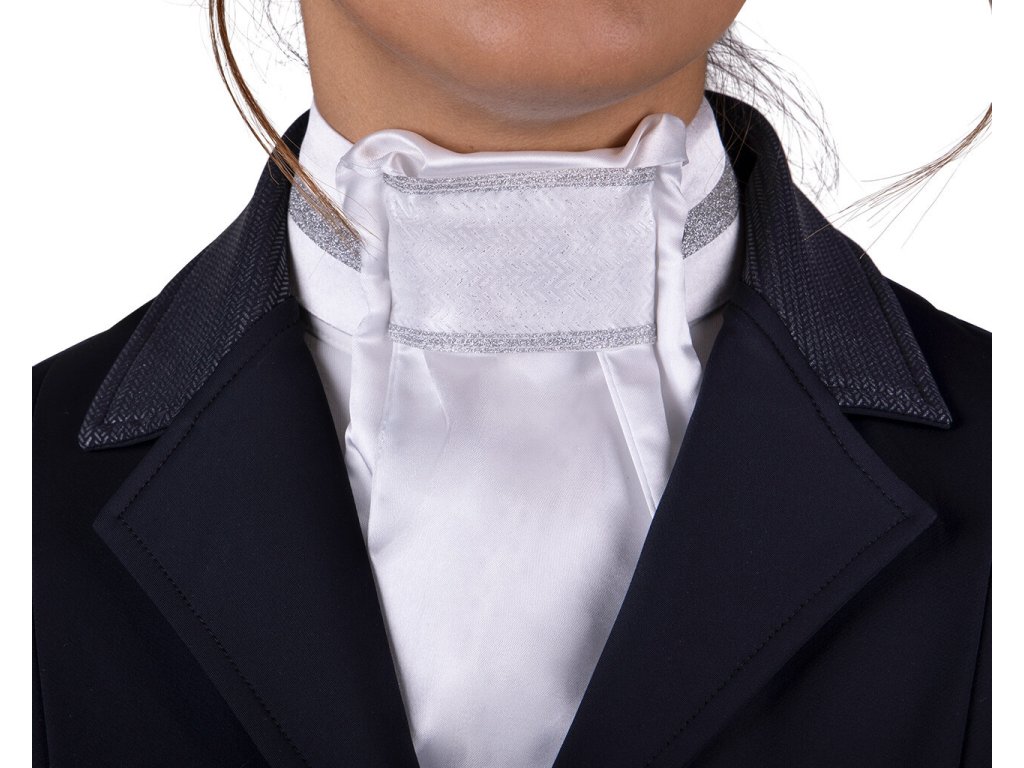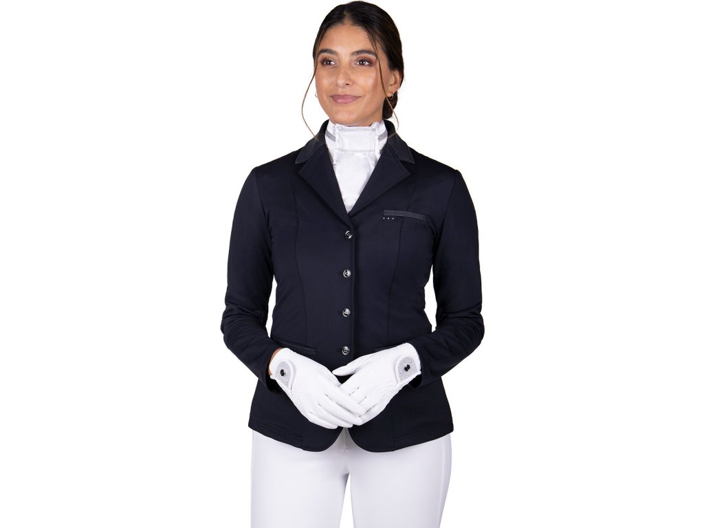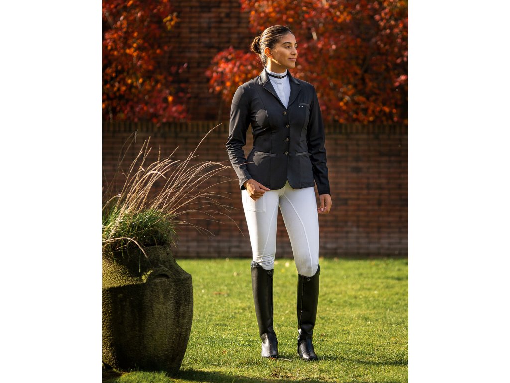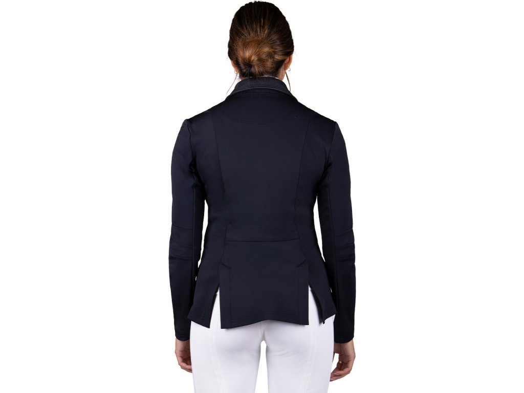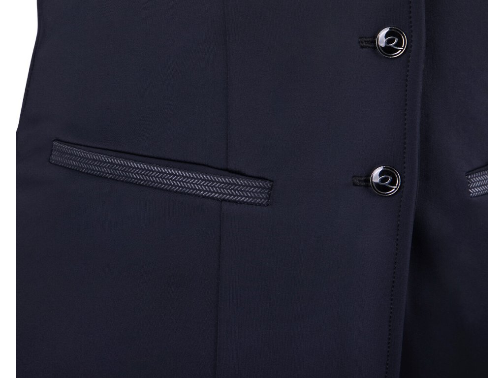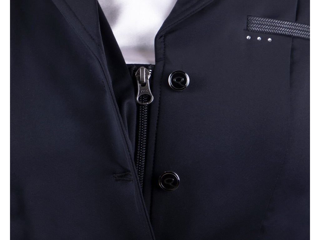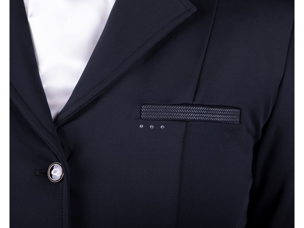Bardzo wysokiej jakości kurtka konkursowa wykonana z wysoce oddychającego i elastycznego materiału, który zapewnia maksymalny komfort. Wyposażona w praktyczne zapięcie na zamek błyskawiczny, które jest ukryte za guzikami. Kołnierz i kieszenie są ozdobione wzorem, który sprawia, że cała kurtka jest wyjątkowa. Trzy lśniące cyrkonie wraz z rozcięciem z tyłu dodają bardzo eleganckiego wyglądu. Kurtka konkursowa jest również dostępna w rozmiarach dla dzieci i idealnie pasuje do innych produktów z kolekcji Kae.