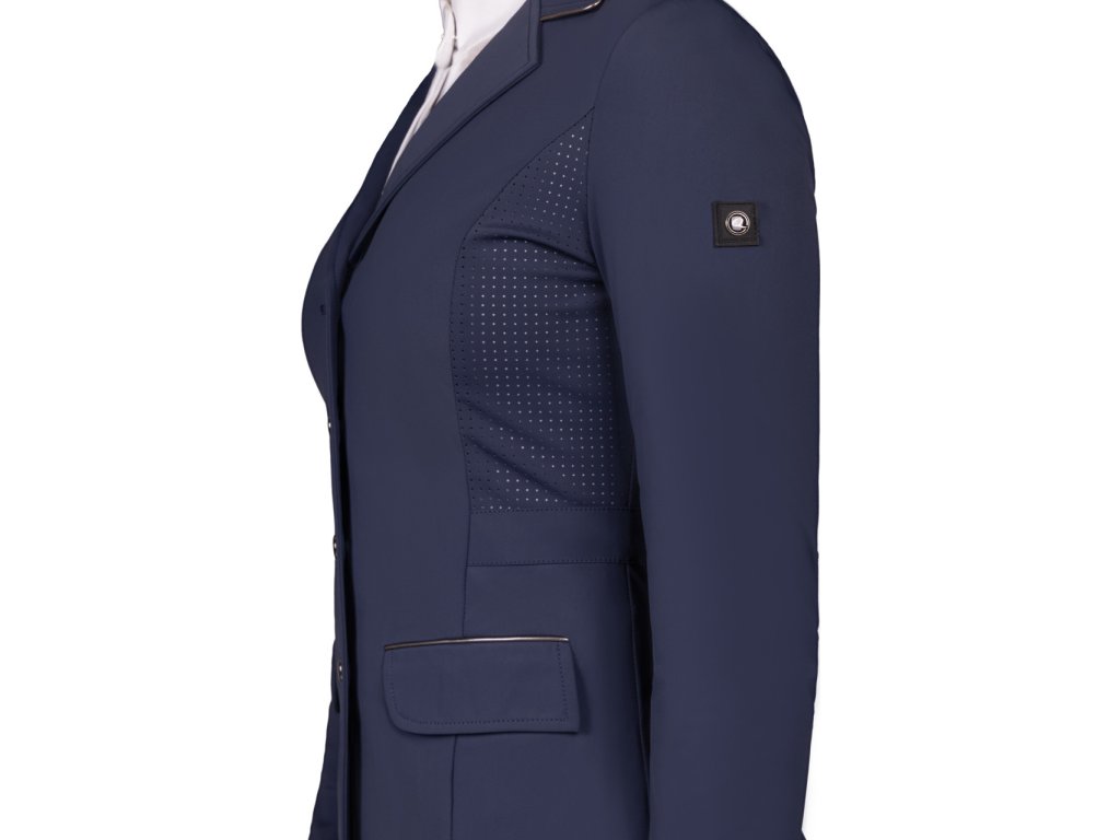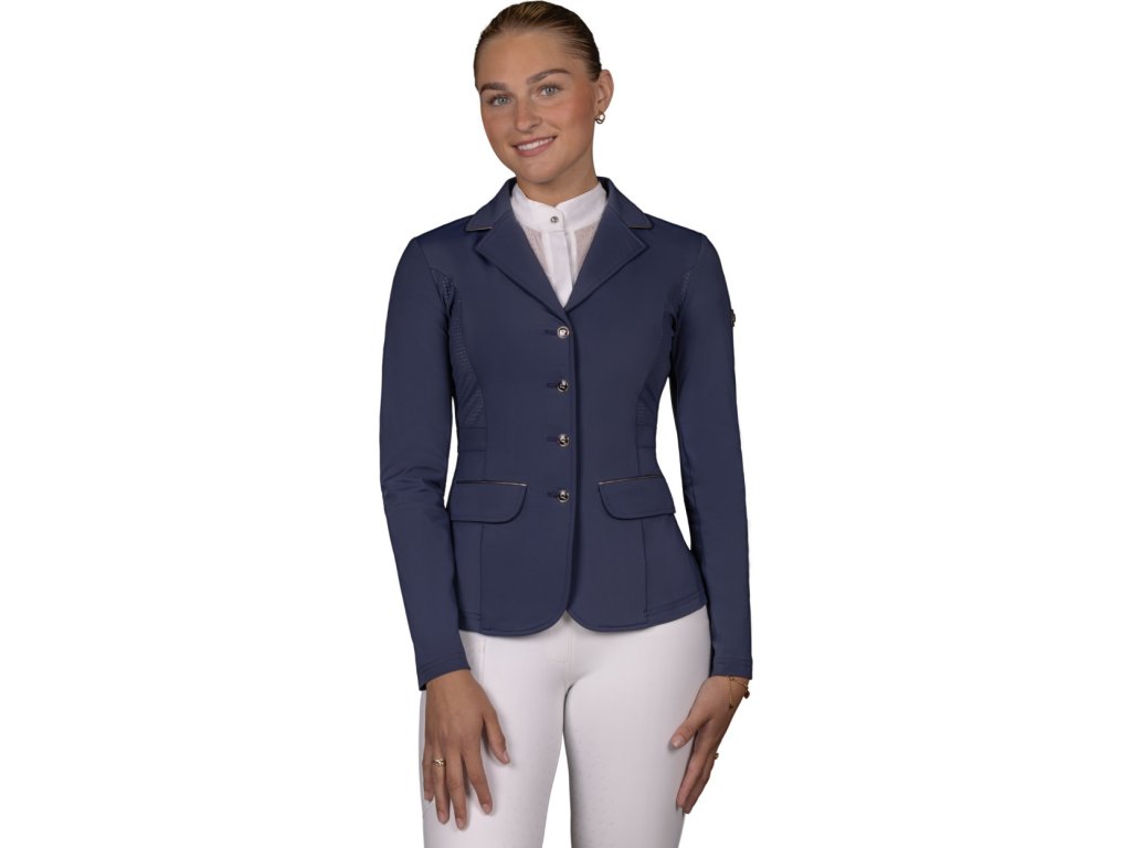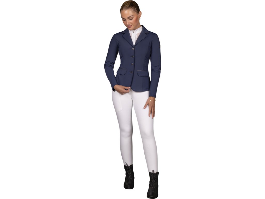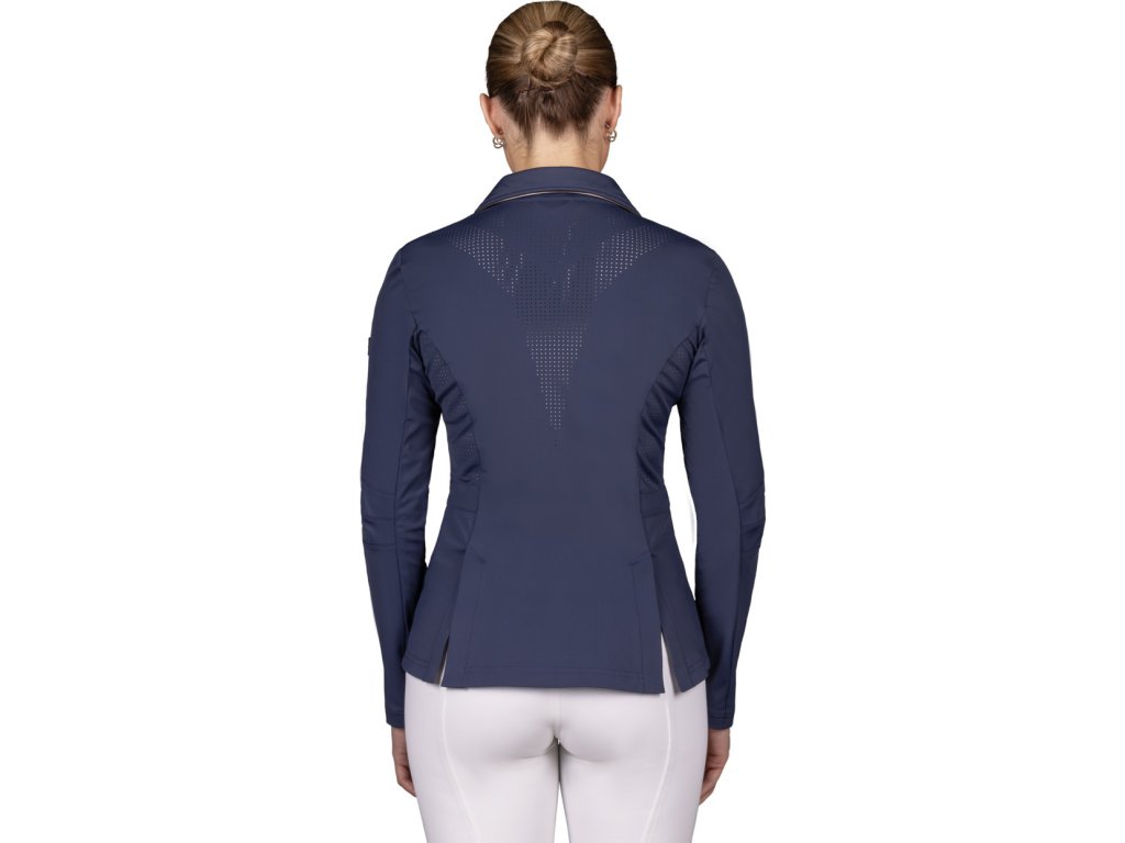 Wysokiej jakości kurtka konkursowa wykonana z lekkiego i oddychającego materiału. Rozciągliwy w czterech kierunkach materiał zapewnia komfort noszenia. Frak jest wyposażony w otwory wentylacyjne na plecach i pod pachami. Technologia mapowania ciała została wykorzystana do umieszczenia otworów wentylacyjnych w celu uzyskania najlepszego efektu. Kurtka jest zatem bardzo oddychająca i wygodna, odpowiednia na ciepłe letnie dni. Nie można pominąć dwóch bocznych kieszeni i podwójnego rozcięcia. Elegancki wygląd tworzą subtelne wykończenia wokół kołnierza i kieszeni. Praktyczne zapięcie na zamek błyskawiczny i guziki.Modelka na zdjęciach ma 172 cm wzrostu i nosi rozmiar 36.