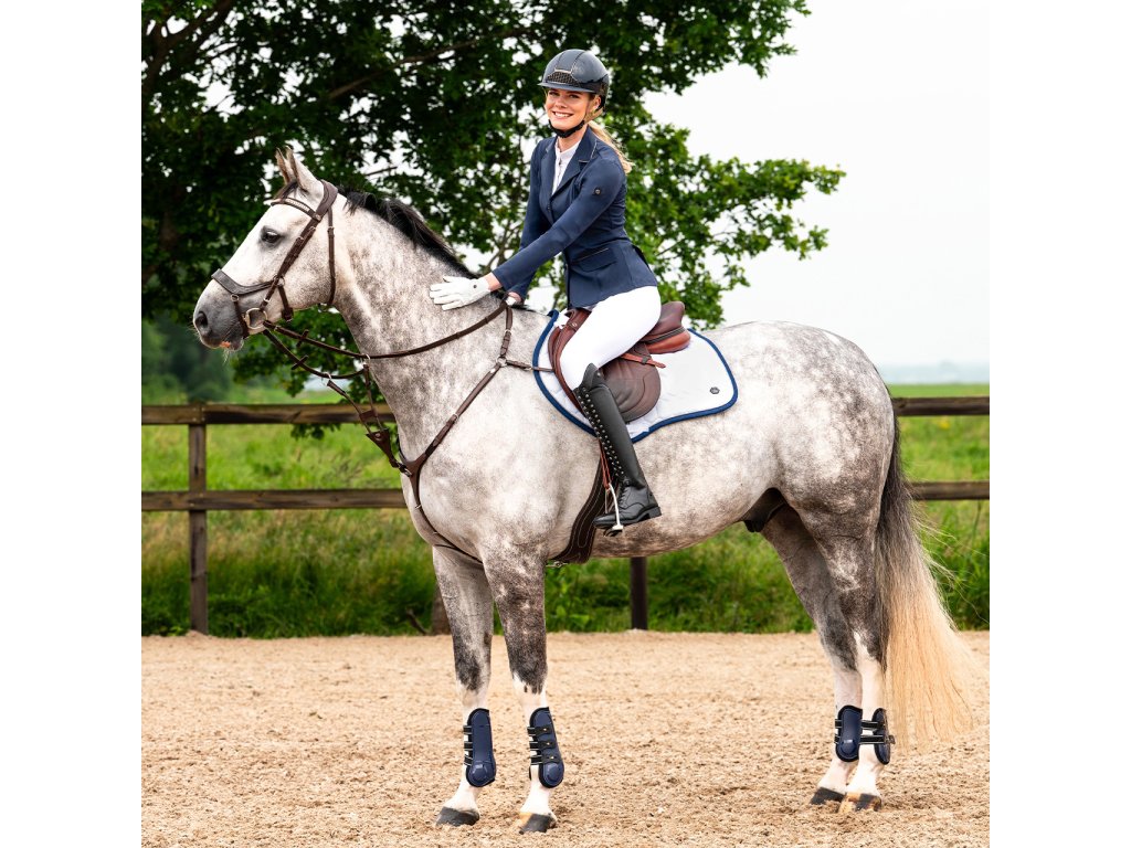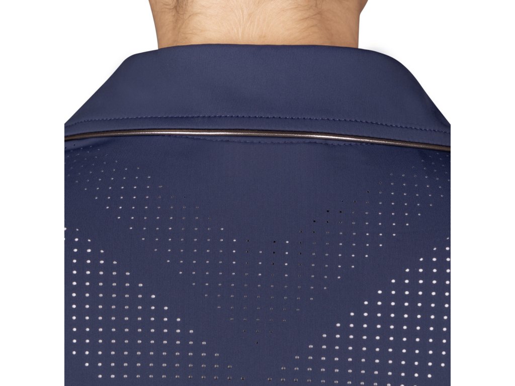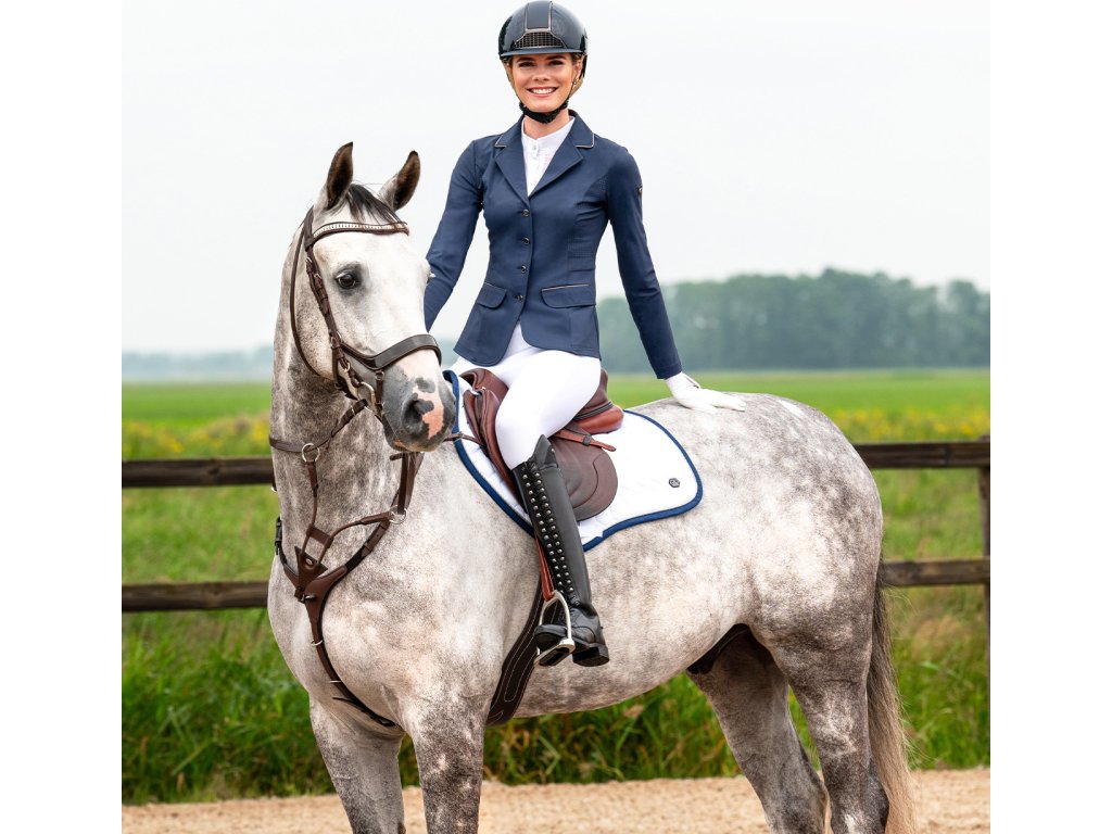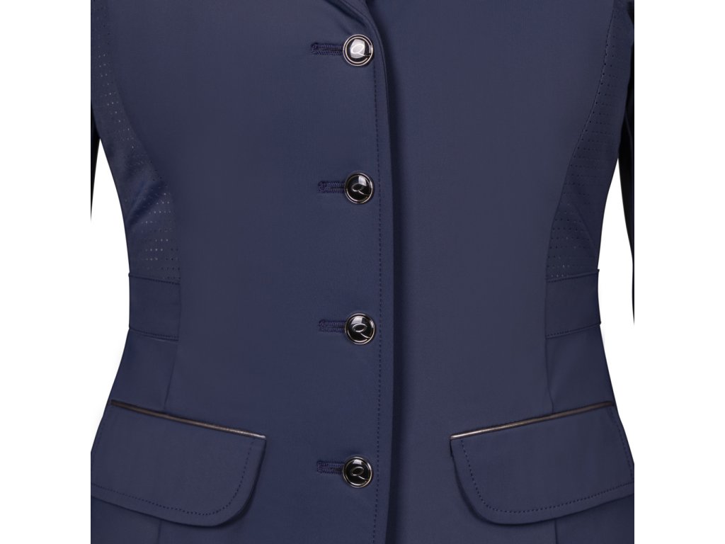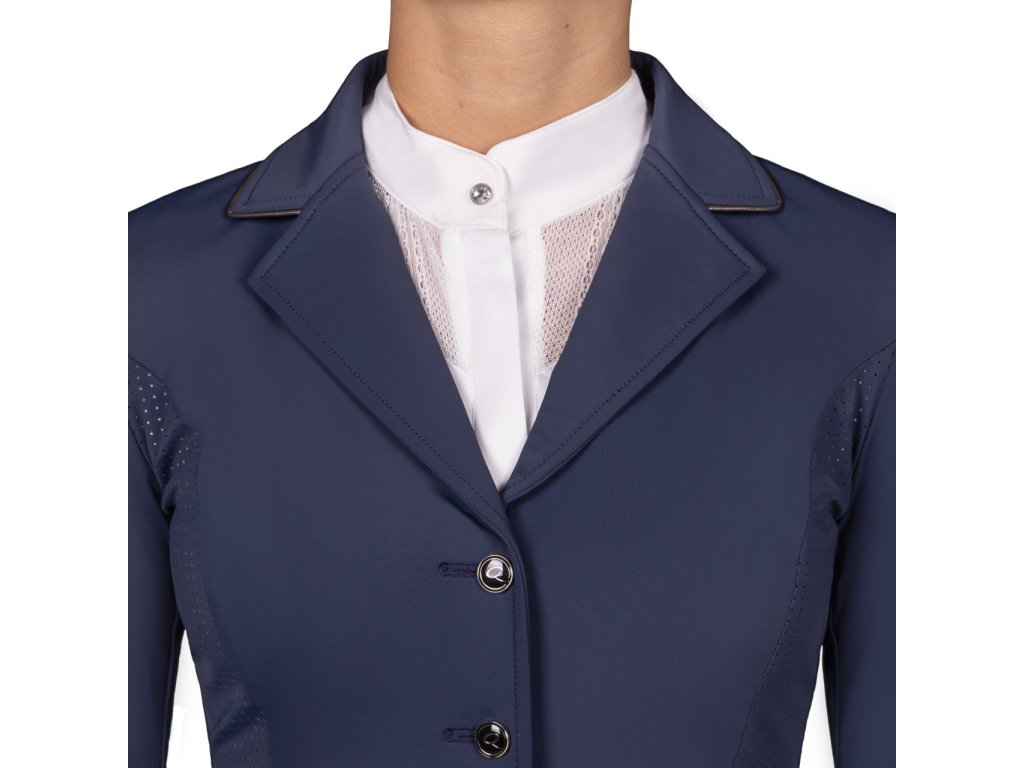 Wysokiej jakości kurtka konkursowa wykonana z lekkiego i oddychającego materiału. Rozciągliwy w czterech kierunkach materiał zapewnia komfort noszenia. Frak jest wyposażony w otwory wentylacyjne na plecach i pod pachami. Technologia mapowania ciała została wykorzystana do umieszczenia otworów wentylacyjnych w celu uzyskania najlepszego efektu. Kurtka jest zatem bardzo oddychająca i wygodna, odpowiednia na ciepłe letnie dni. Nie można pominąć dwóch bocznych kieszeni i podwójnego rozcięcia. Elegancki wygląd tworzą subtelne wykończenia wokół kołnierza i kieszeni. Praktyczne zapięcie na zamek błyskawiczny i guziki.Modelka na zdjęciach ma 172 cm wzrostu i nosi rozmiar 36.