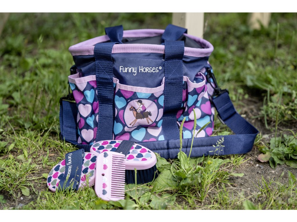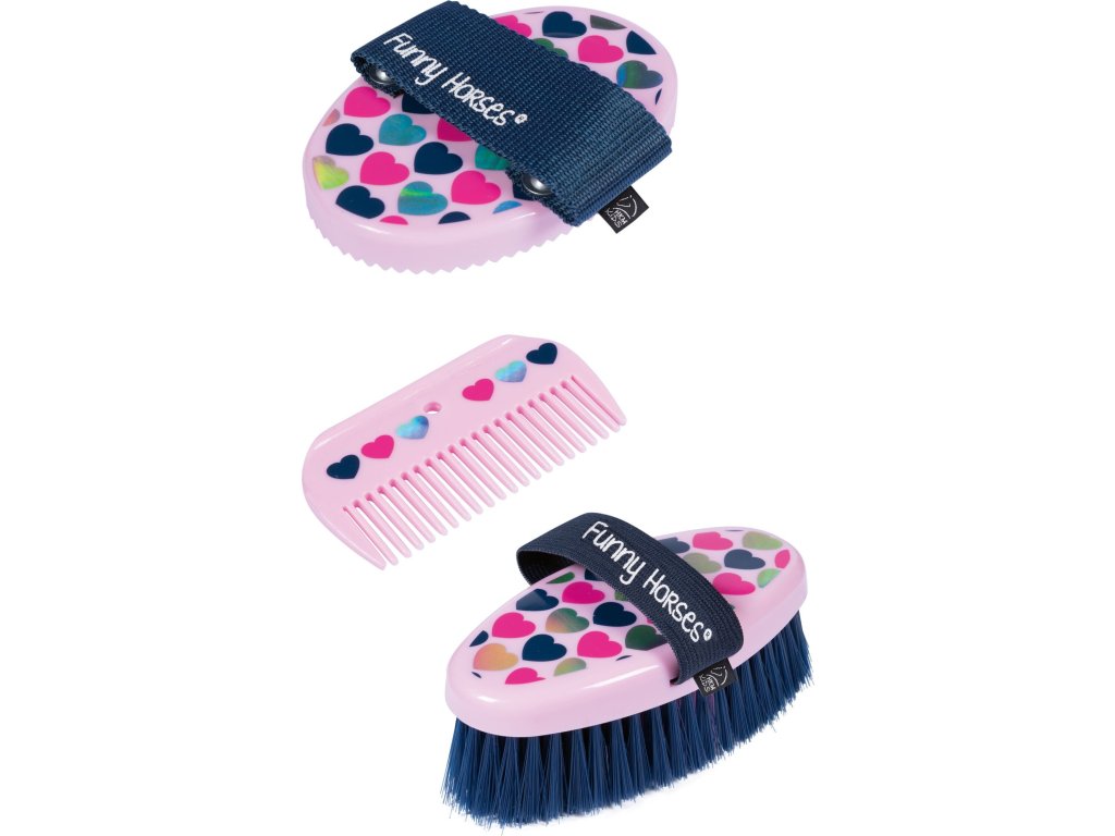 Dziecięcy zestaw do pielęgnacji z uroczym motywem. Zestaw zawiera: plastikowe zgrzebło, grzebień do grzywy i szczotkę do ciała. Do zestawu można dokupić pasującą torbę. Może być również używany do zabawy z Hobby horse.