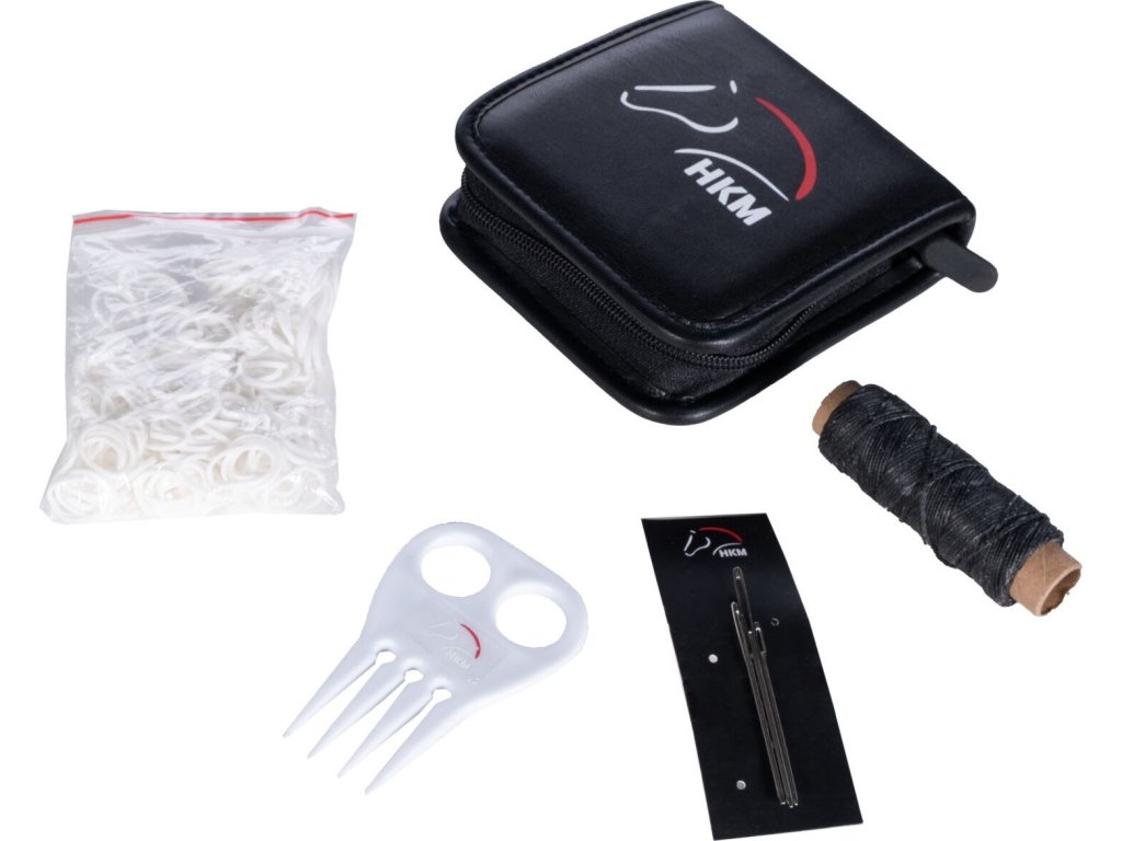 Ten praktyczny zestaw do zaplatania grzywy zawiera grzebień, 250 gumek do grzywy, 50 metrów woskowanej nici i trzy igły (o długości 5, 6 i 7 cm). Dostarczany w etui z zapięciem na zamek błyskawiczny. Dostępne w kolorze czarnym i białym.