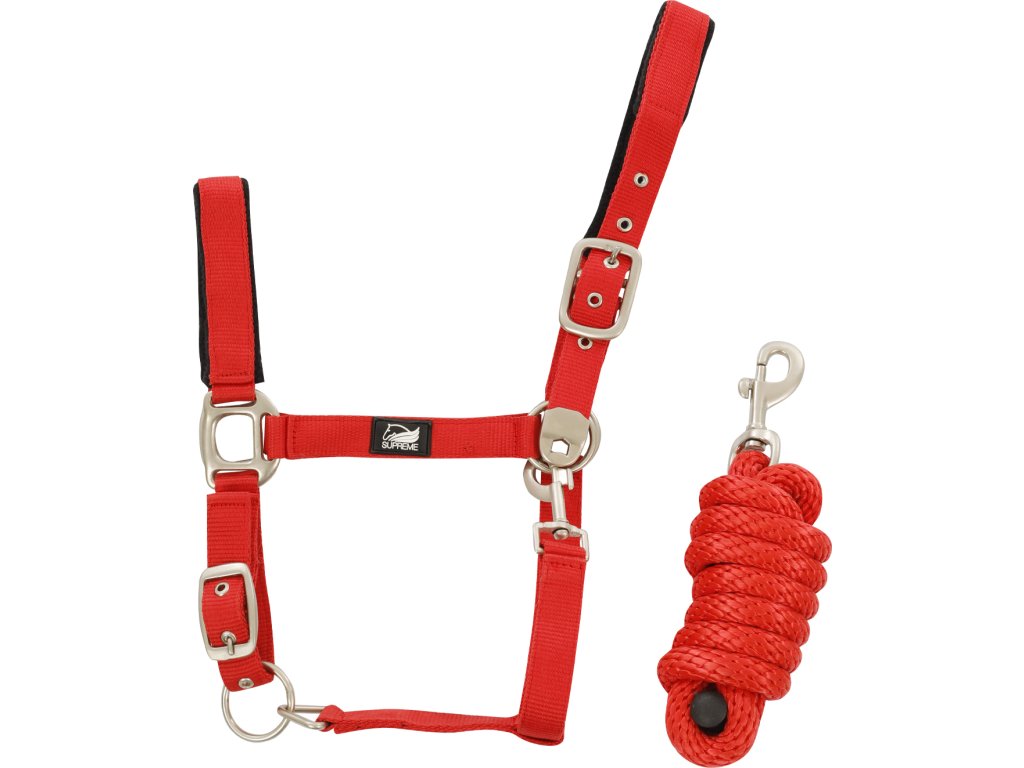 Zestaw kantara i uwiązu Supreme. Kantar wykonany jest z nylonu. Wyposażony w regulowany pasek potyliczny i nachrapnik, miękko wyściełany w tych miejscach. Wyposażone w srebrne okucia. Produkowany w rozmiarach PONY, COB i FULL. Dostępne w wielu kolorach.