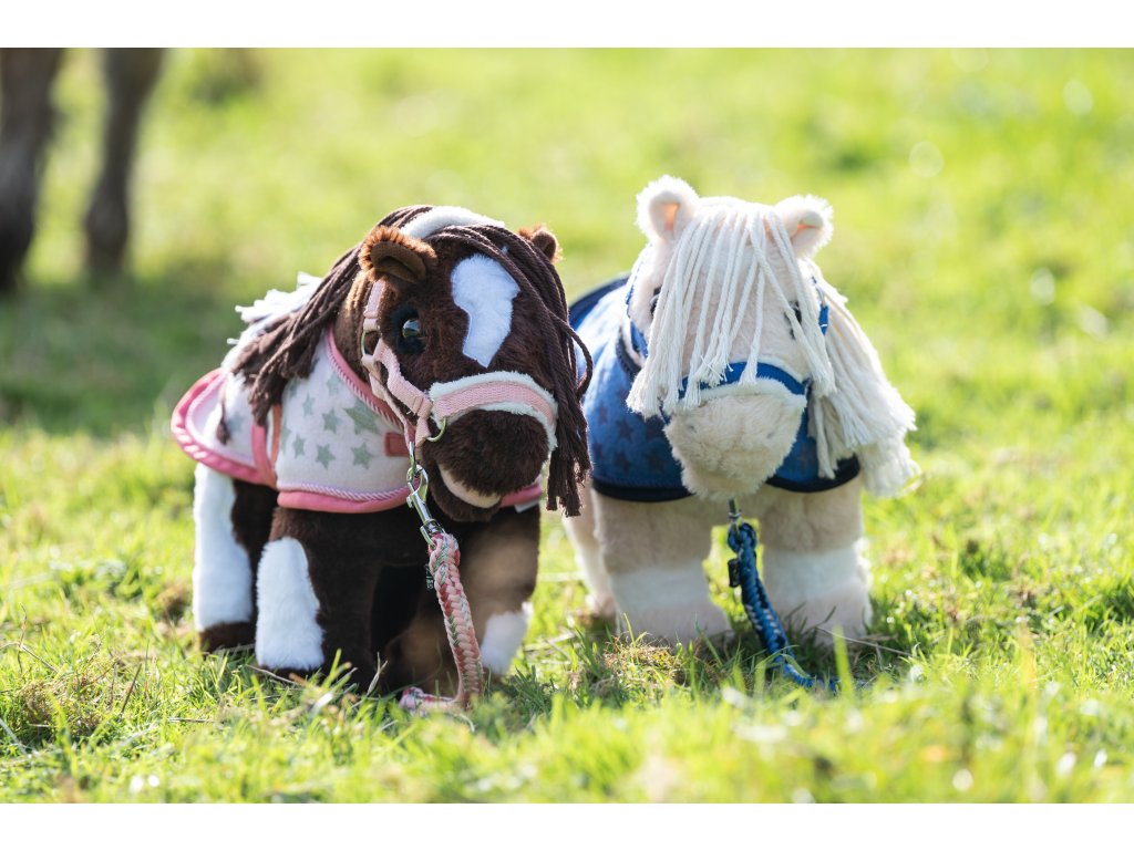 Zestaw dla pluszowych kucyków Cuddle Pony składający się z derki chłodzącej, kantara i uwiązu. Derka ma proste zapięcie z przodu na rzep i zapięcie na krzyż pod brzuchem. Zdobione motywem gwiazdy. Kantar ma miękkie wypełnienie ze sztucznej owczej skóry na nachrapniku i pasku potylicznym. Zestaw można prać w pralce w temperaturze 30 stopni. Nie nadaje się do suszarki.