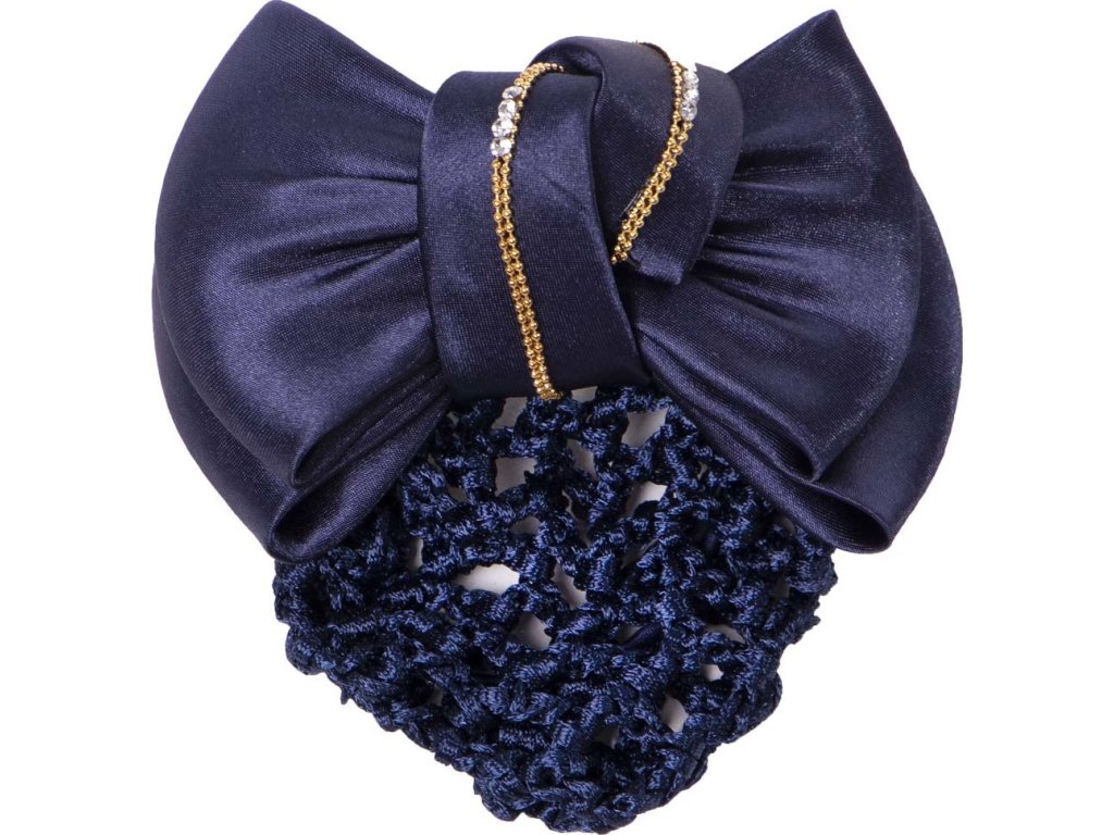 Siatka do włosów ozdobiona satynową kokardą. Kokarda jest ozdobiona złotym łańcuszkiem i srebrnymi cyrkoniami, które dodają eleganckiego wyglądu. Wyposażona w zatrzask, za pomocą którego siatka jest łatwo mocowana. Dostępne również w kolorze czarnym.