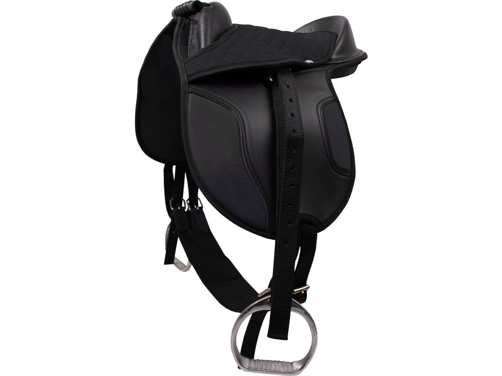 Siodło dziecięce w pełni wyposażone w popręg, strzemiona i paski. Posiada również uchwyty do trzymania i kółko do podogonia. Siodło jest lekkie i świetnie nadaje się dla małych początkujących jeźdźców.