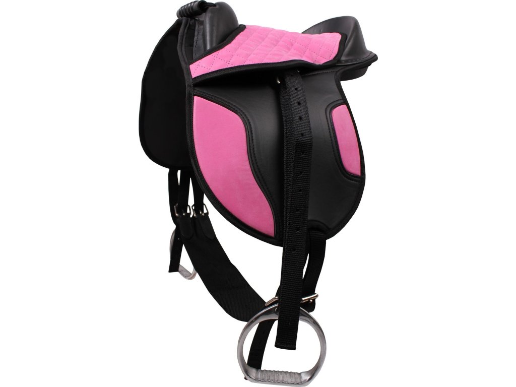 Siodło dziecięce w pełni wyposażone w popręg, strzemiona i paski. Posiada również uchwyty do trzymania i kółko do podogonia. Siodło jest lekkie i świetnie nadaje się dla małych początkujących jeźdźców.